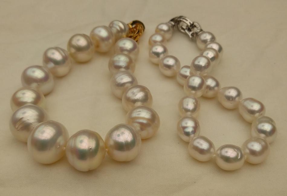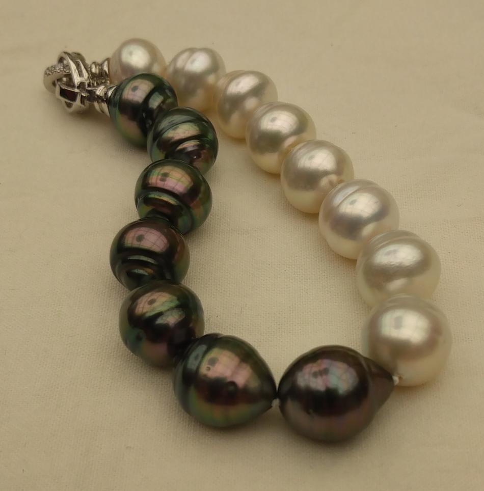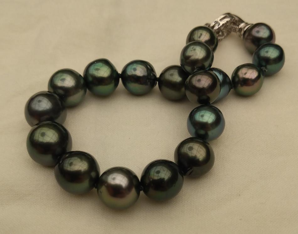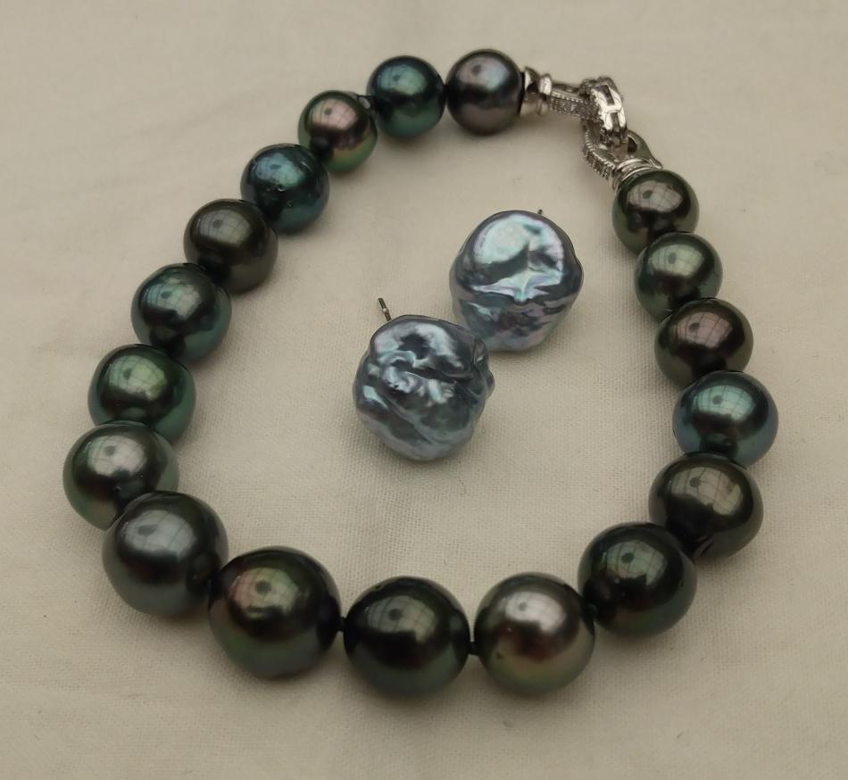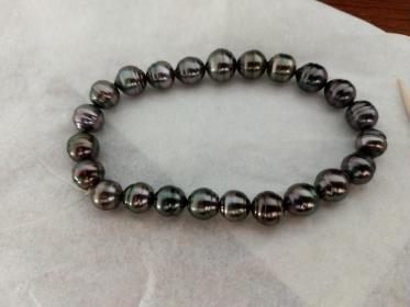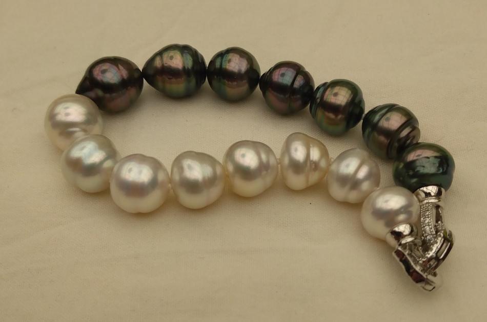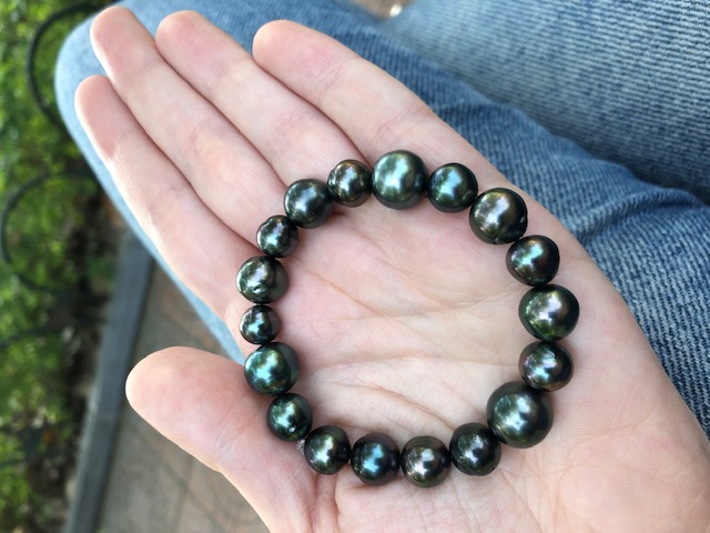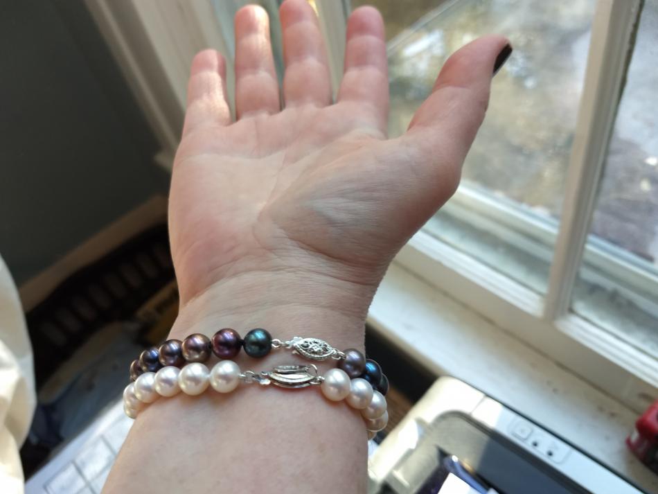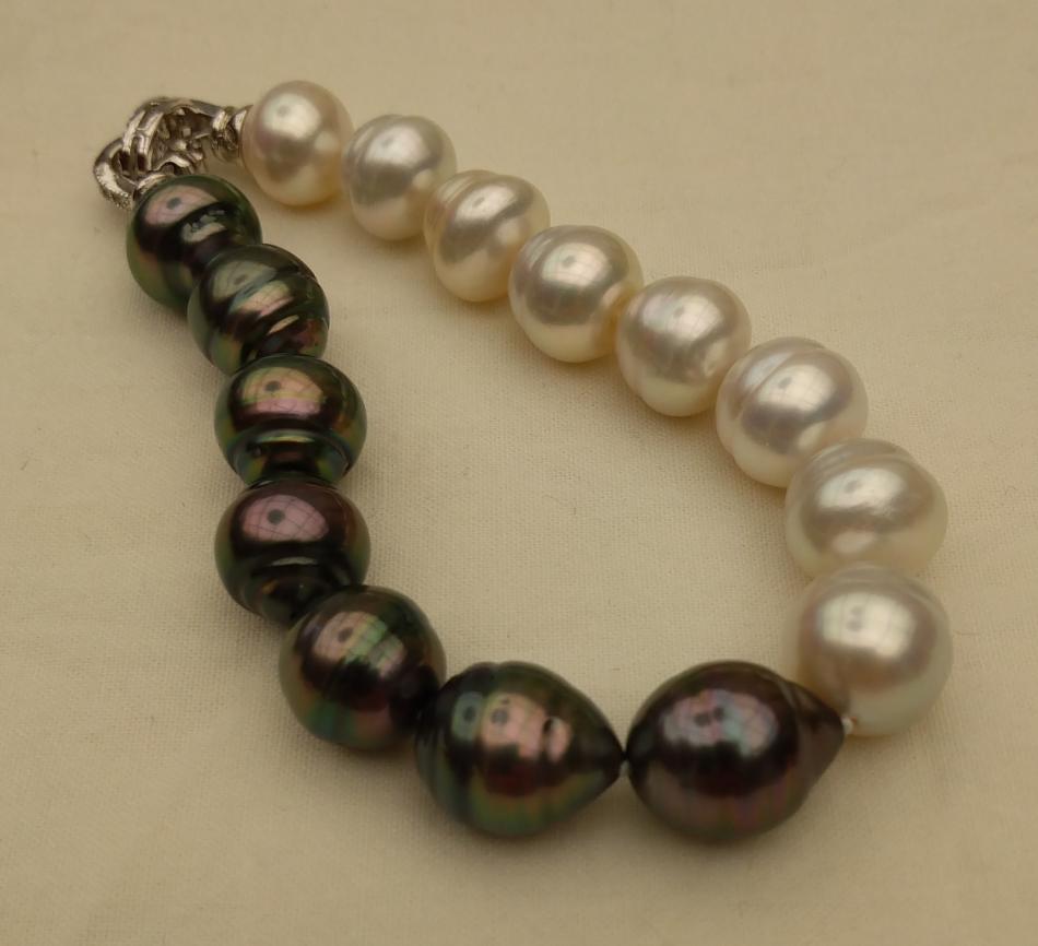 I made these three 8,5 inches so that they sit nicely on my wrist. I also made a circled peacock tahitian and white south sea bracelet, the tahitians are from Druzydesign, don't remember where I got the white ones from.