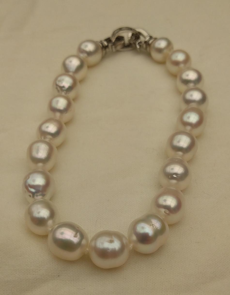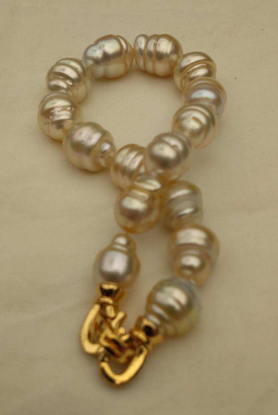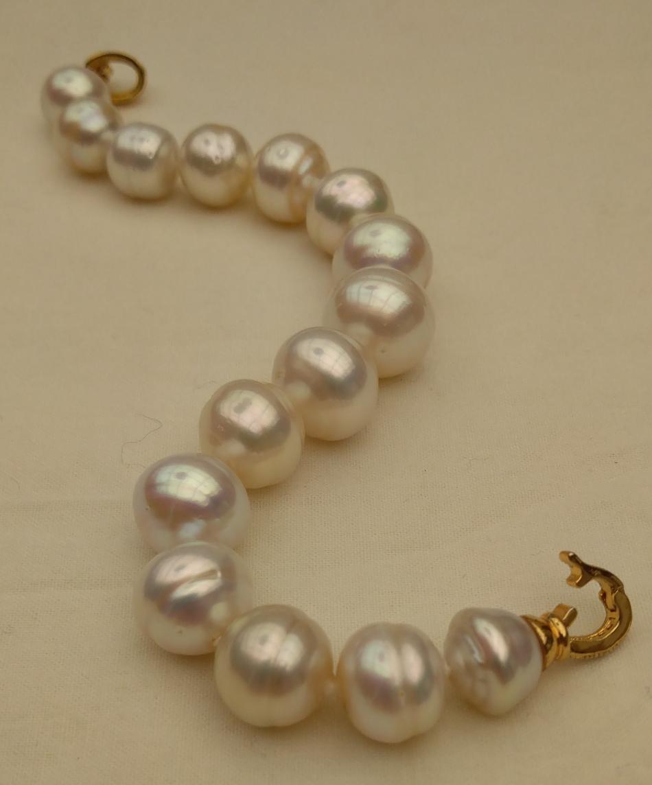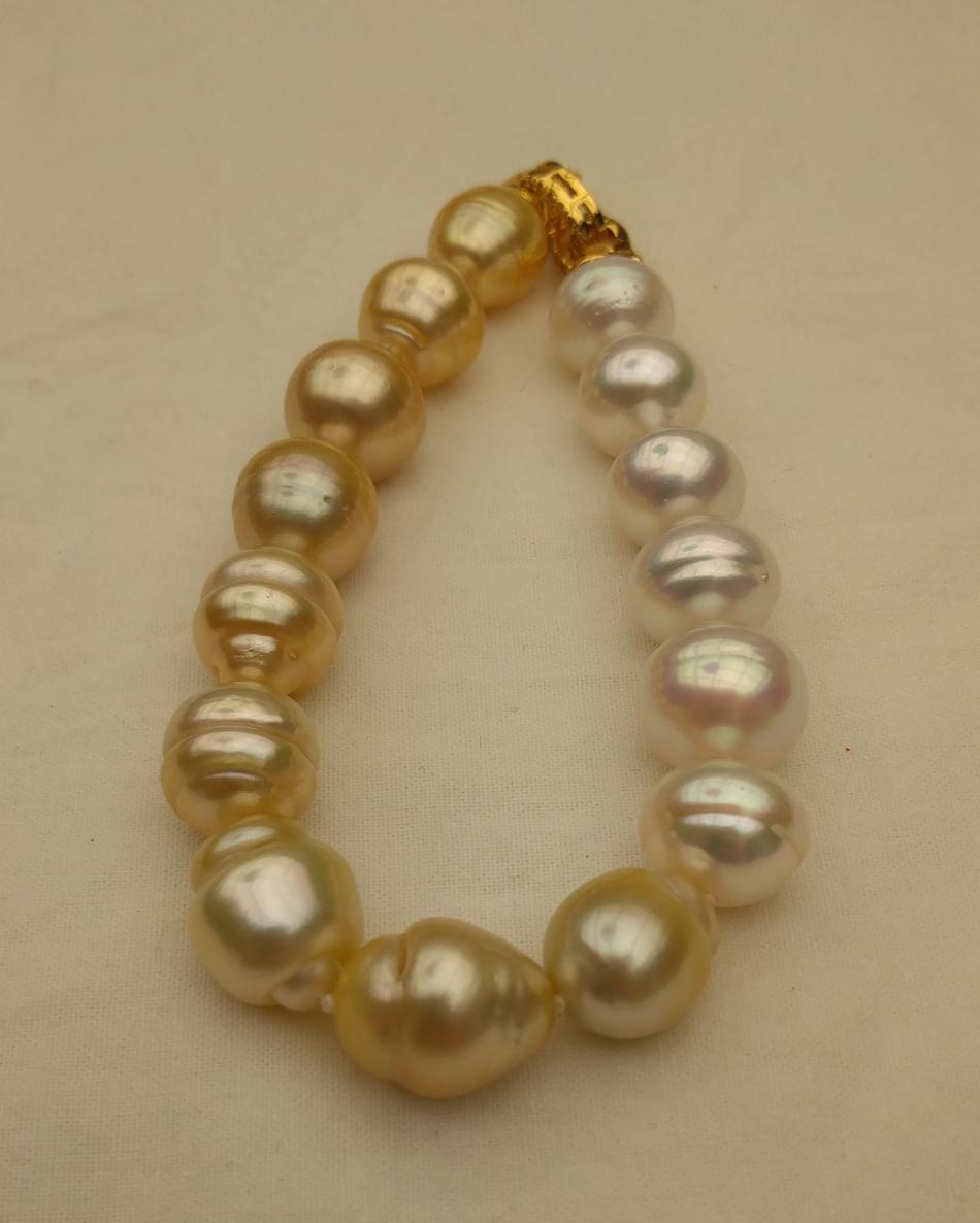 I finally have some bracelets to share. It appears that I only like pearl bracelets on me if they are somewhat chunky, that's funny because usually I prefer smaller (8-11 mm pearls) for necklaces. Well I have some exceptions, I love that new big circled golden south sea strand I just bought from Wendy, I have worn that a lot. Anyway, I have been tweeking these five bracelets, adding or changing out pearls for a while and I think that they are perfect, for me, now. First an ombre golden to white circled south sea bracelet to go with my new ombre golden to white circled south sea strand that I recently made. I love this bracelet and I can use it to make the strand a rope if I want to.
