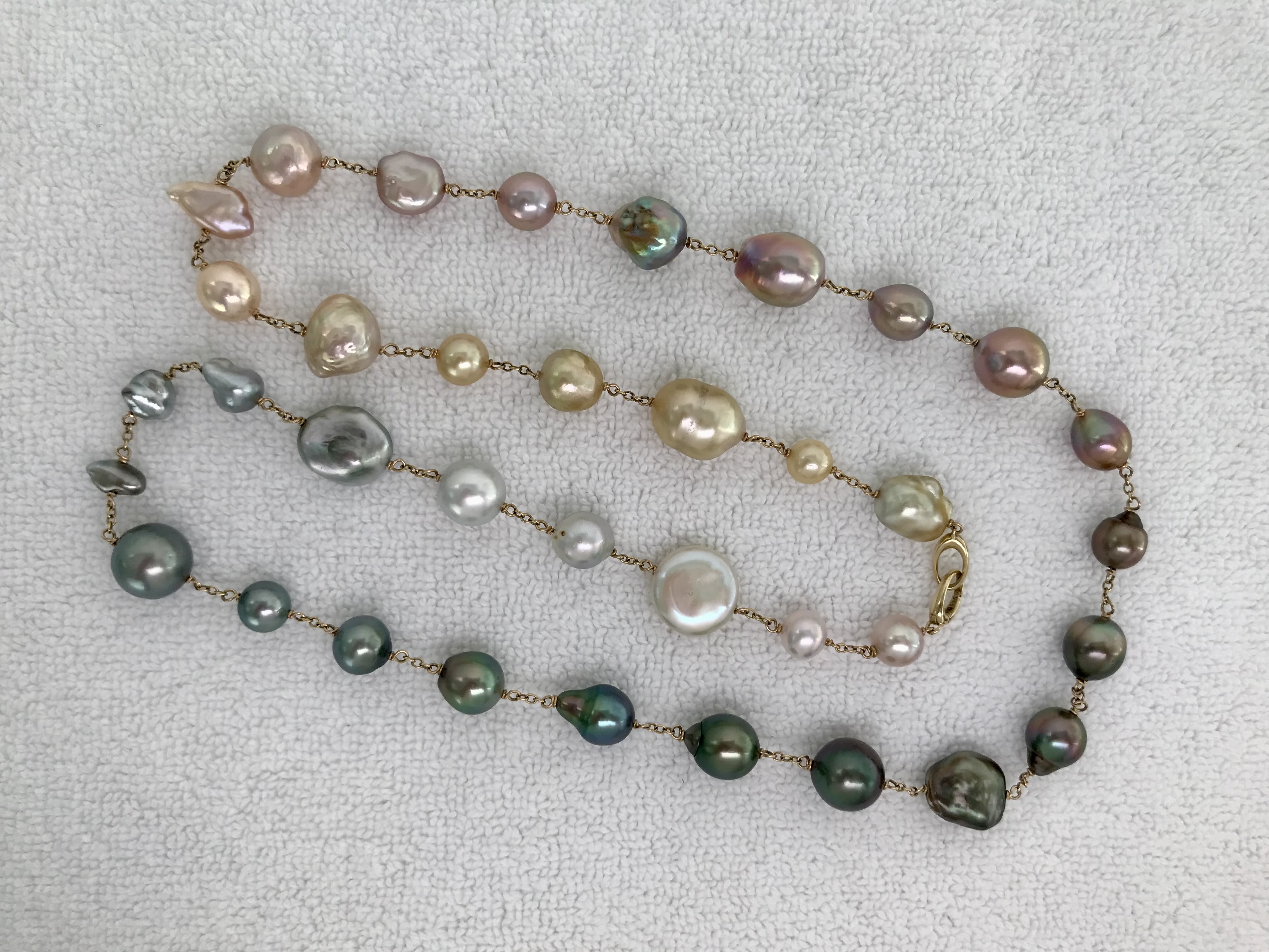 All things I put together- an opera length of light to medium golden SS, a station chain of vintage Akoya from PacificPearls.US, and SS and Akoya earrings.