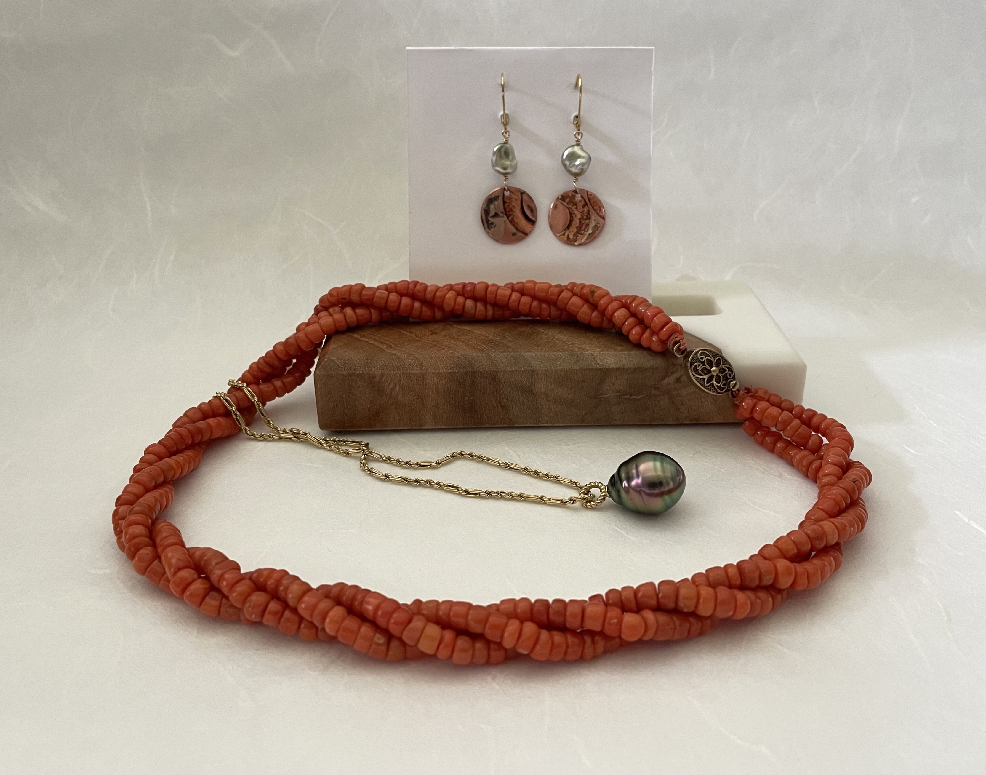 Vintage coral from Kojima, a Tahitian pendant from Hawaii, and Tahitian keshi I added to earrings from a San Francisco metal artist.