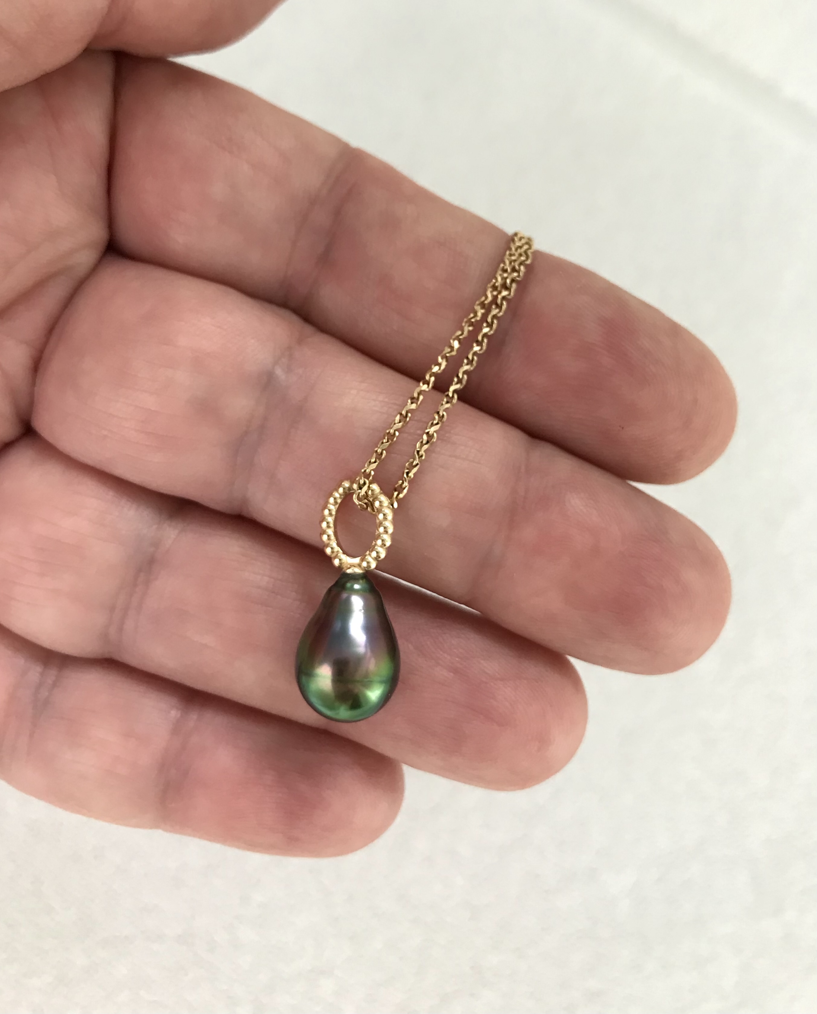 And I JUST got off the Zoom with Hisano this minute. The Wishbone setting was too small for the Kasumi pearl. It would have looked weird. But I was already leaning towards a little h, yellow gold, round, diamond bail, because it would be the exact same shape and size as the ruby bail I have on my current Kasumi pendant from Kojima. That way, I can wear the pair of them as earring pendants on my diamond hoops, in addition to wearing them on necklaces. I couldn't decide where to drill the hole. This pearl was perfect on all sides. It was hard to decide which color I wanted the be in the up position. The pearl keeps changing colors has you twirl it around.