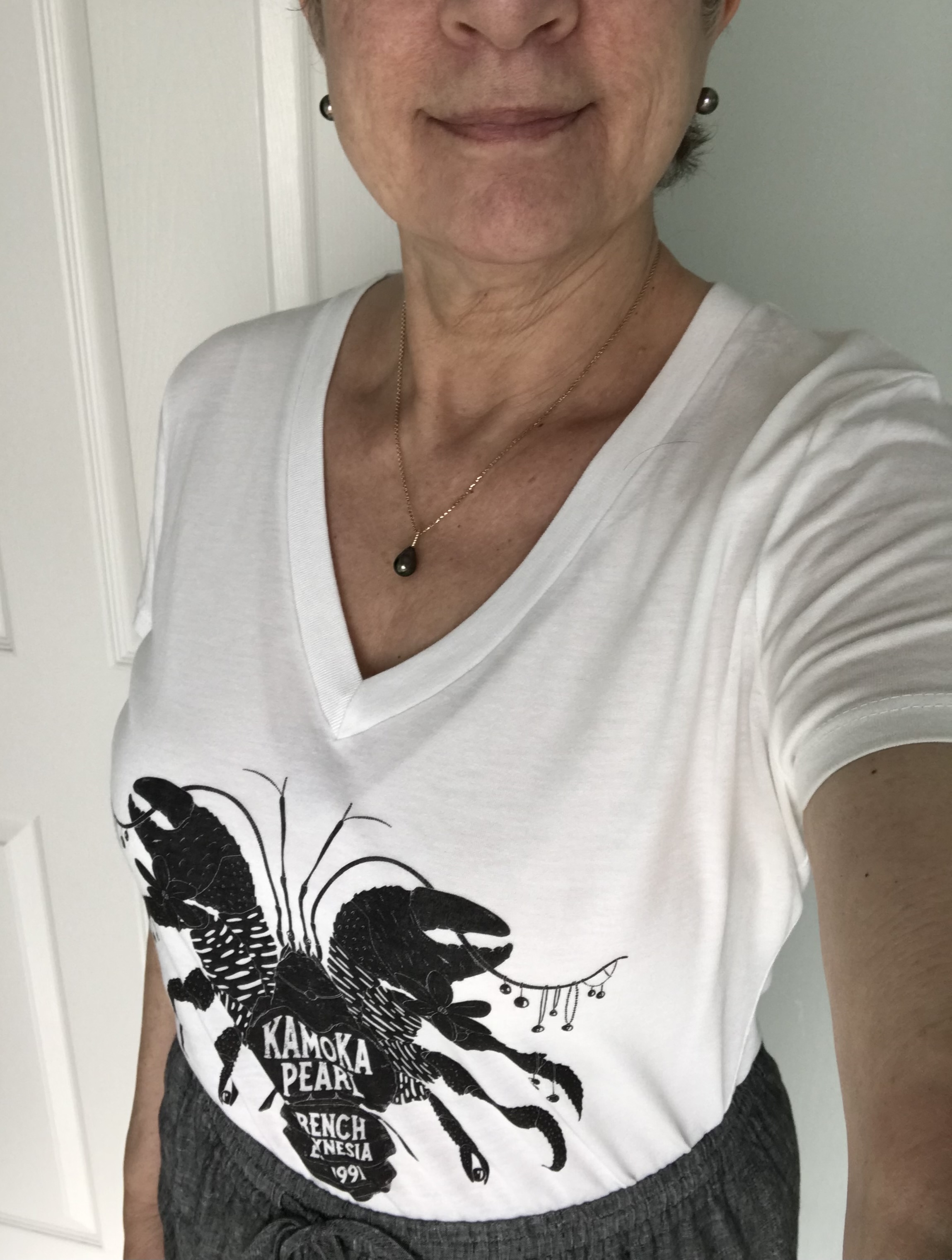 66% Kamoka chested today. Ocean's Cove Tahitian earrings. La Petite Perlagrina pendant from Kamoka. Small, but very colorful and very shiny. I can't shake the feeling the crab is tweaking my nipples.