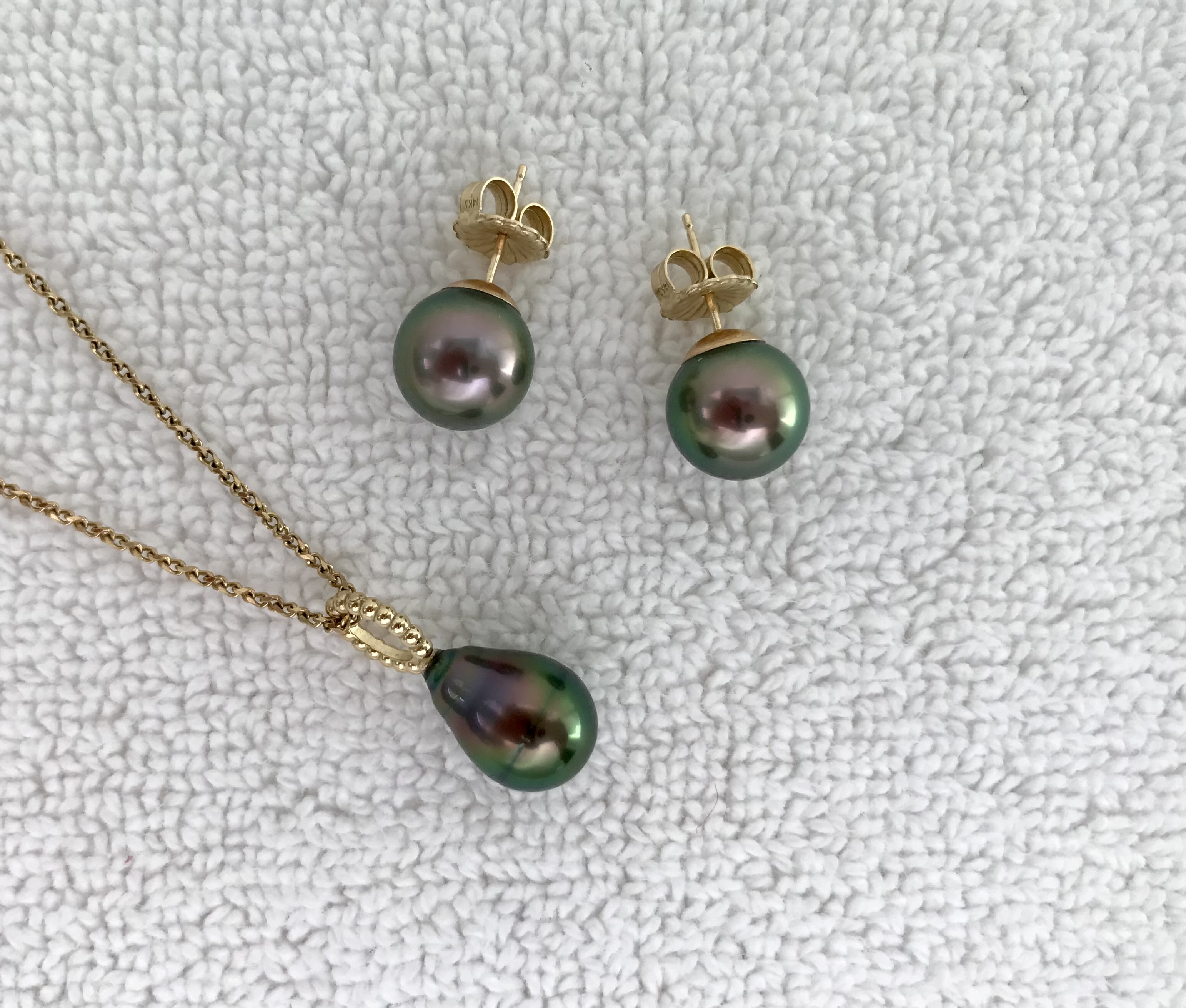 Light bulb moment here. My wife has two pair of Cook Islands keshi studs, one a little greener than the other but otherwise interchangable. No need for two pair, so what if we take one pair and dangle a couple of SOC keshi from each? Will bring the available pieces along to PBTB for a look on Saturday.