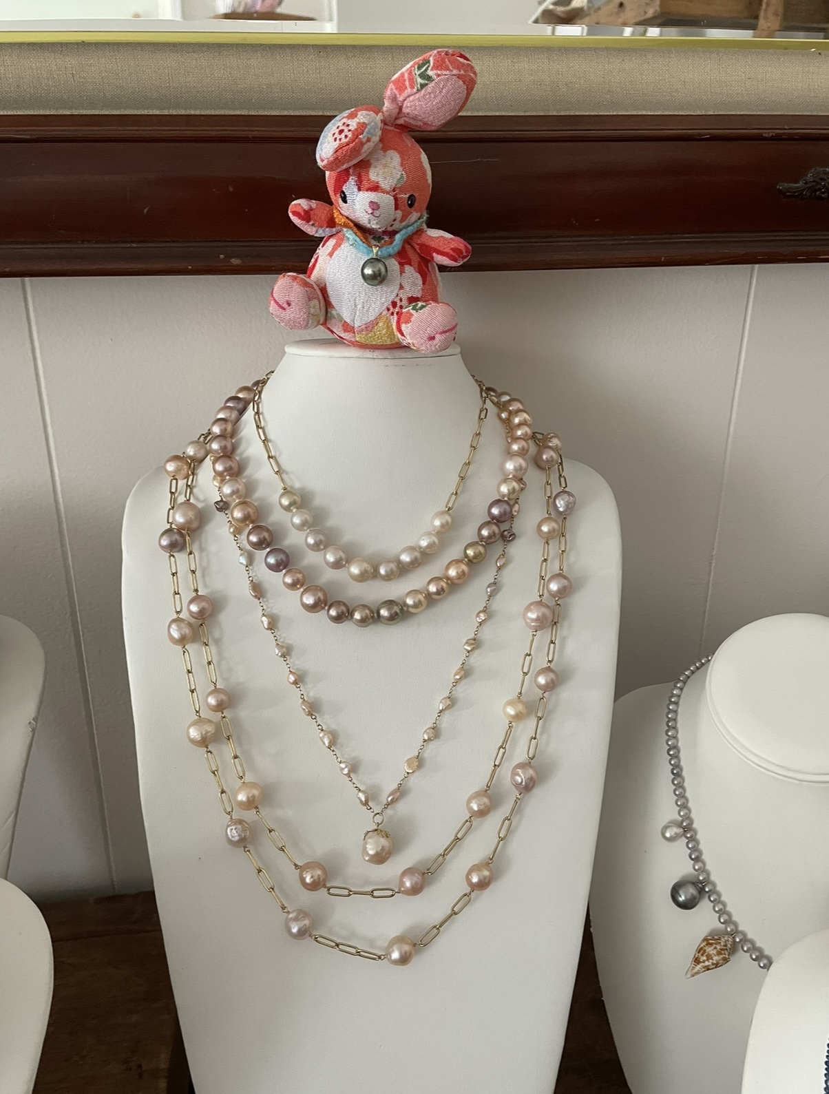 They match my maiden strand perfectly - the mama Ts (9-11mm) are my first ever strand of pearls, and the baby Ts (7-7.75mm) pack a punch when worn standalone, but look so good when twisted together with the mamas.