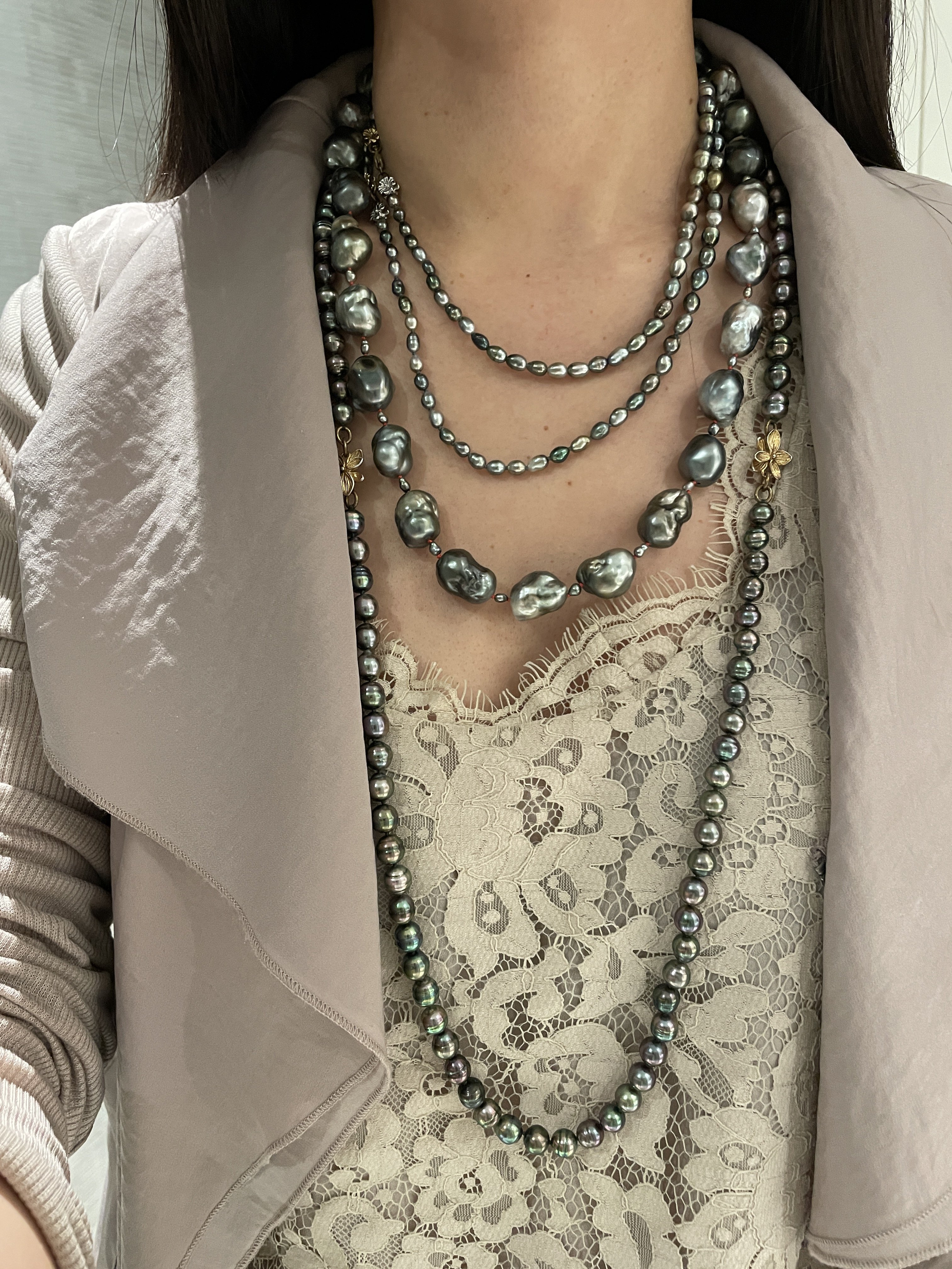 Just beautiful!Sea of Cortez strand and Sea of Cortez keshi necklace from Kojima. Earrings are baroque Akoya from Simply Adorned, and the Tahitian flower ring is from Hawaii.