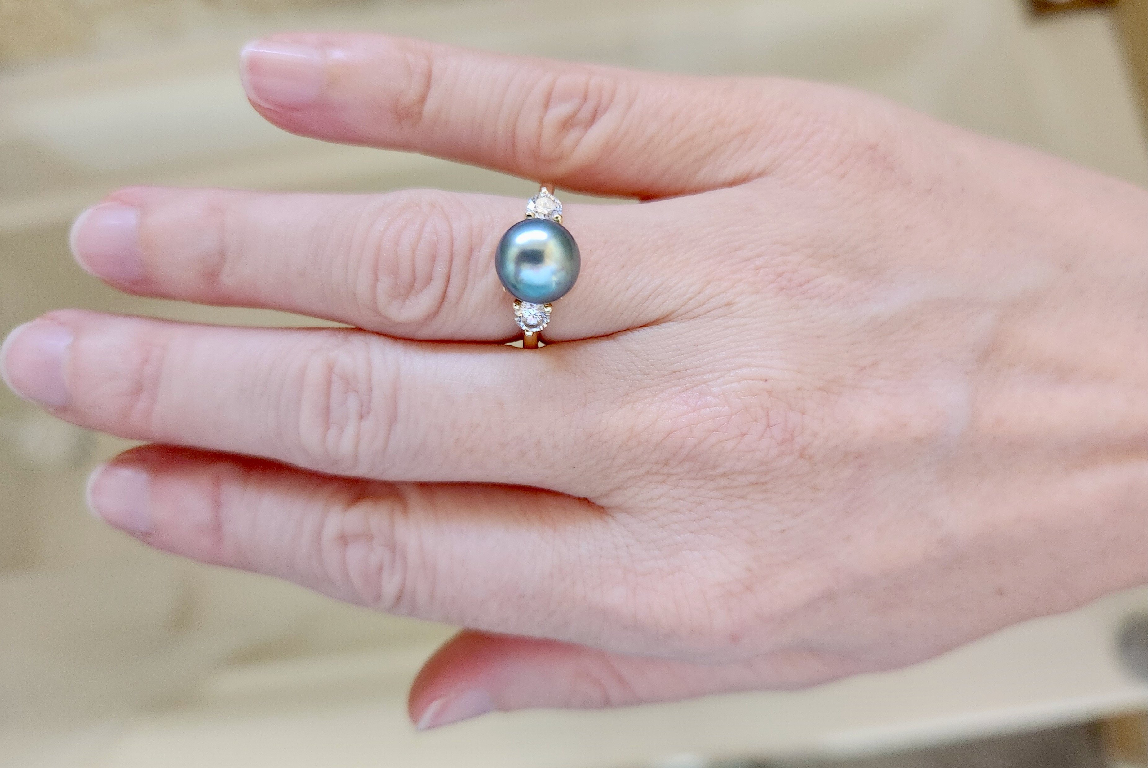 You can see my phone in the reflection of the pearls.