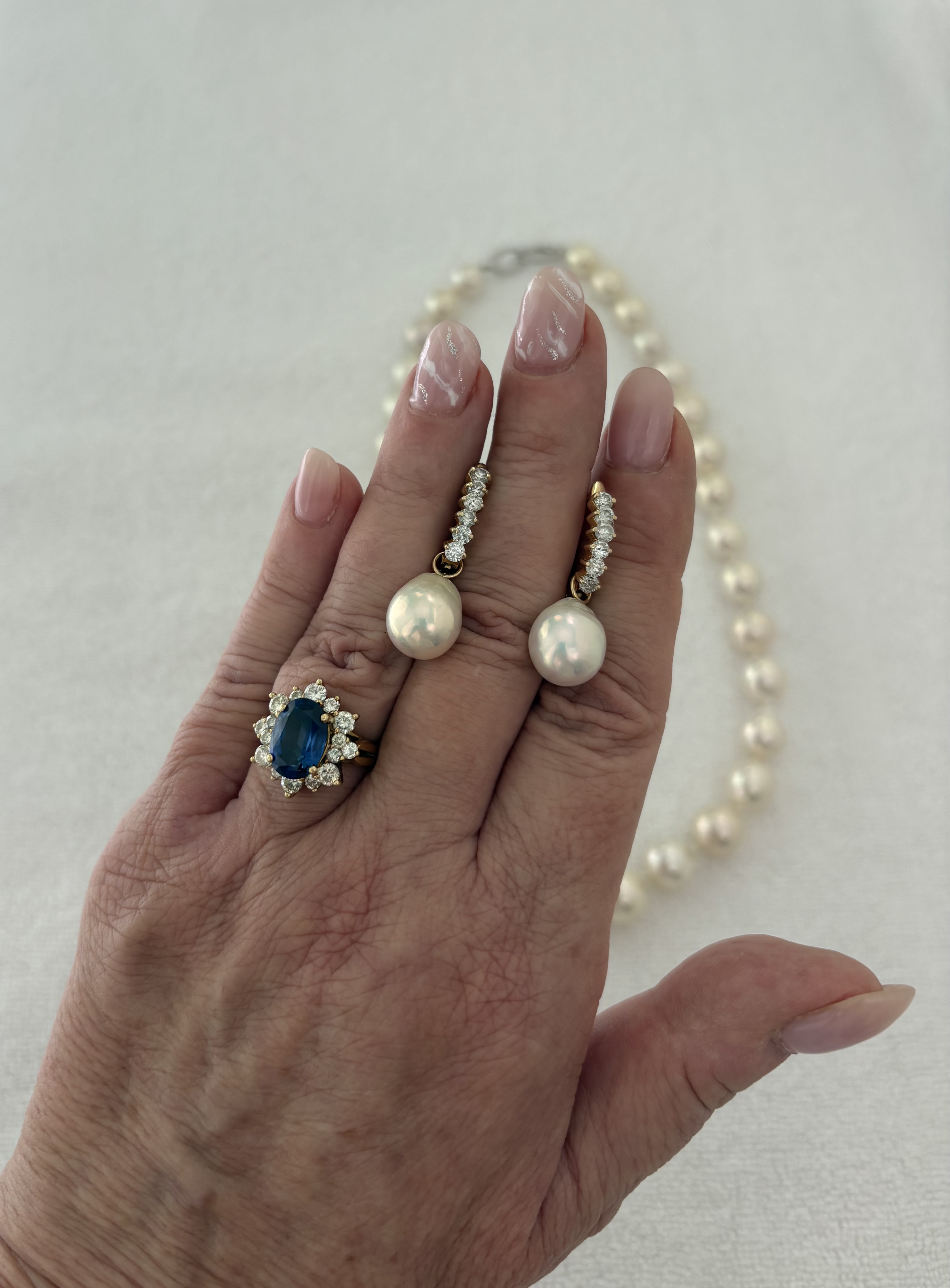 Perfect combination- love the earrings especiallyVisiting Dad today. Wilma Flintstones! Necklace is made of 13.5 mm freshwaters from Kojima, with the luster of akoyas. Earring drops are from Pearls of Joy, worn on Mom's diamond earrings. Mom's "sapphire" ring. It's actually an early tanzanite, when they were more interested in colors that mimicked more expensive gems.