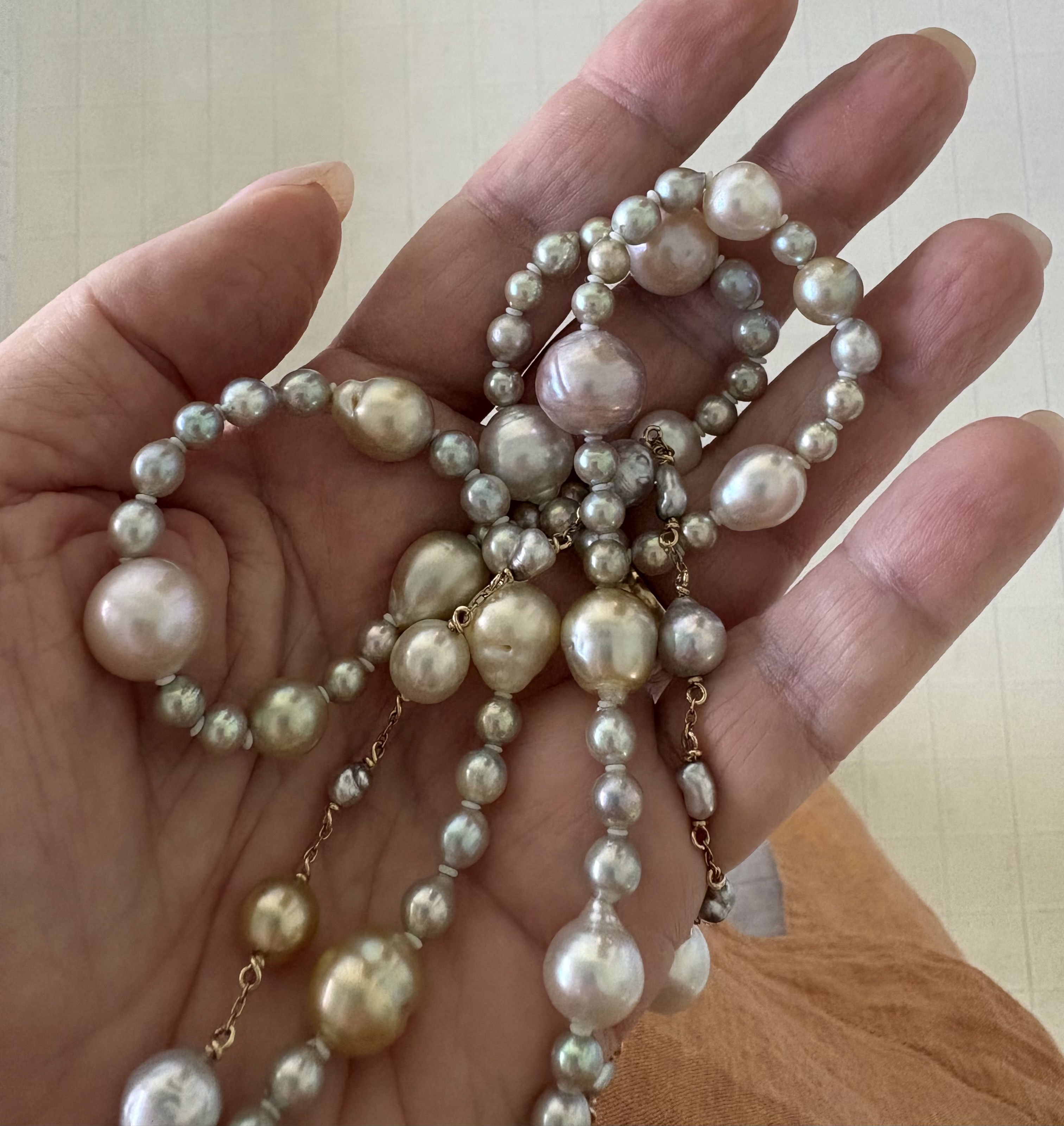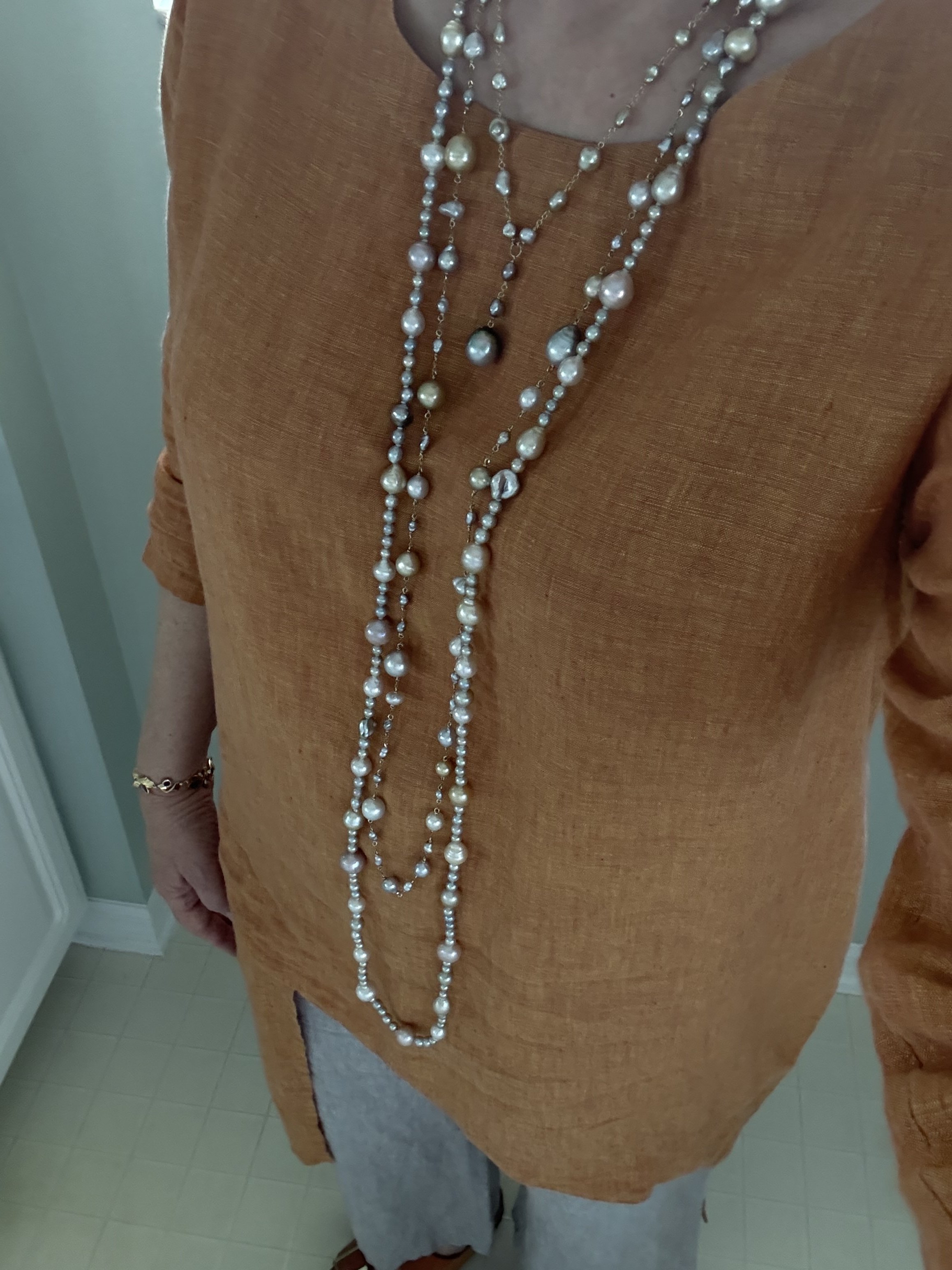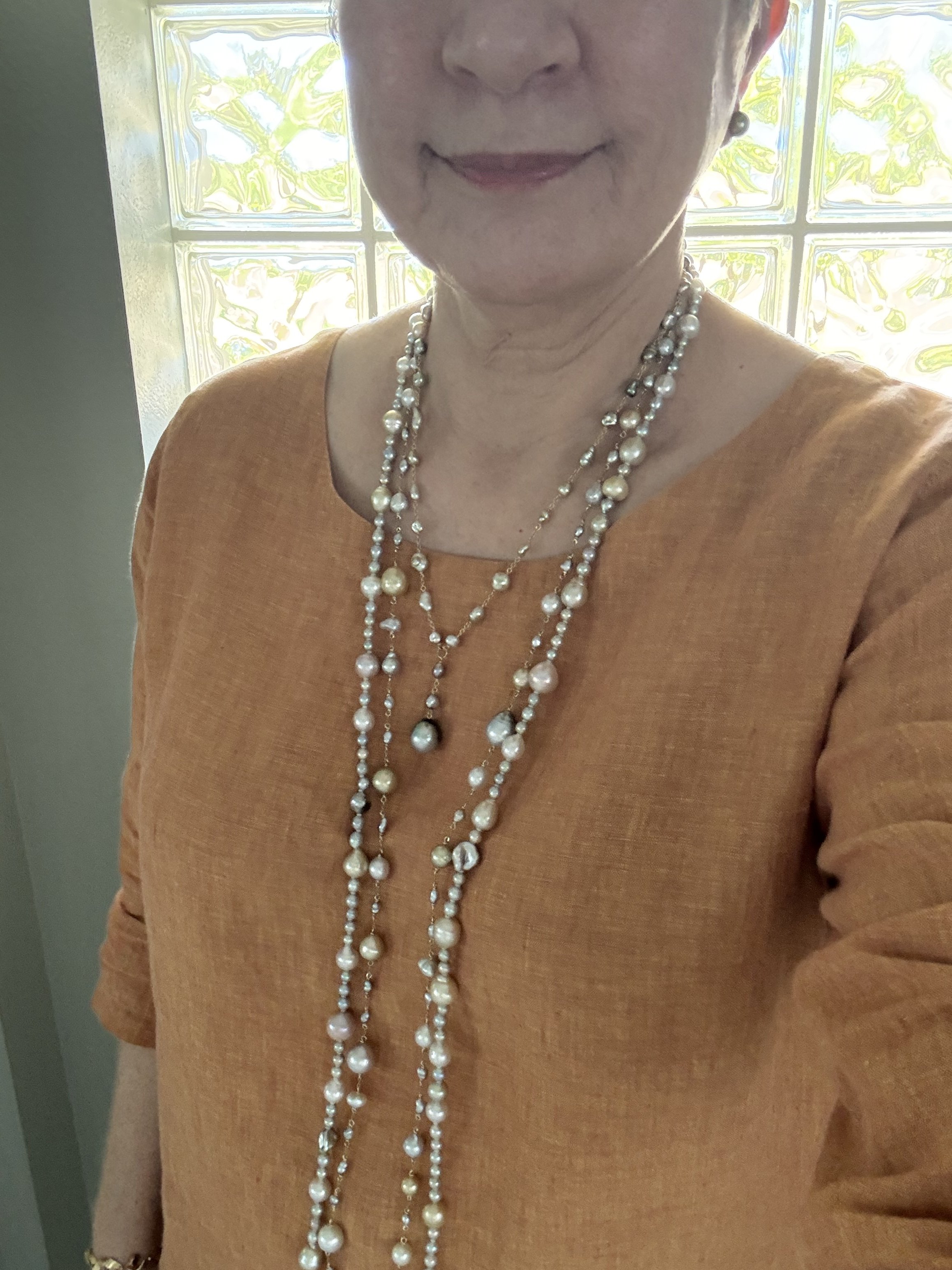 Excellent inspiration! Thank you!Pearly Librarian. I love your little choker and the earrings. Regarding your small BBAs. You could do something like I wore yesterday. My Everything Bagel rope is mostly small BBAs (blue baroque akoyas) and small baroque pistachio akoyas, with all sorts of other larger baroque pearls (South Sea, Tahitians, Kasumi, Freshwaters). It uses the little rubber bumpers between the pearls instead of knots. Or my long tin-cup which is mostly BBA keshi interspersed with baroque South Sea and Tahitians. Of my shorter tin-cup which is pistachio ombre' Tahitian keshi with a Tahitian drop. Pistachio Tahitian earrings. All from Kojima. Unfortunately, the blue and pistachio colors are being neutralized by my orange blouse.