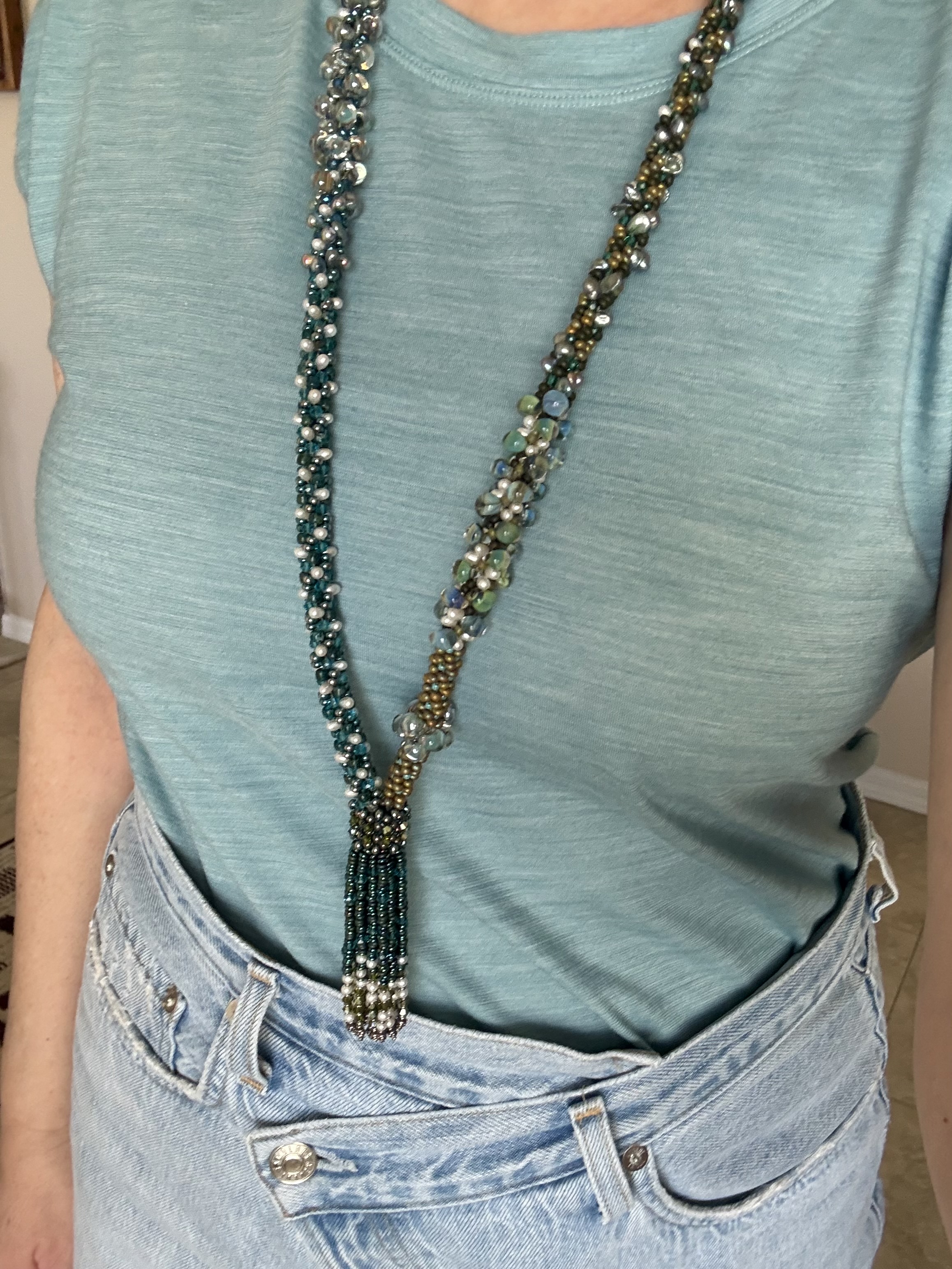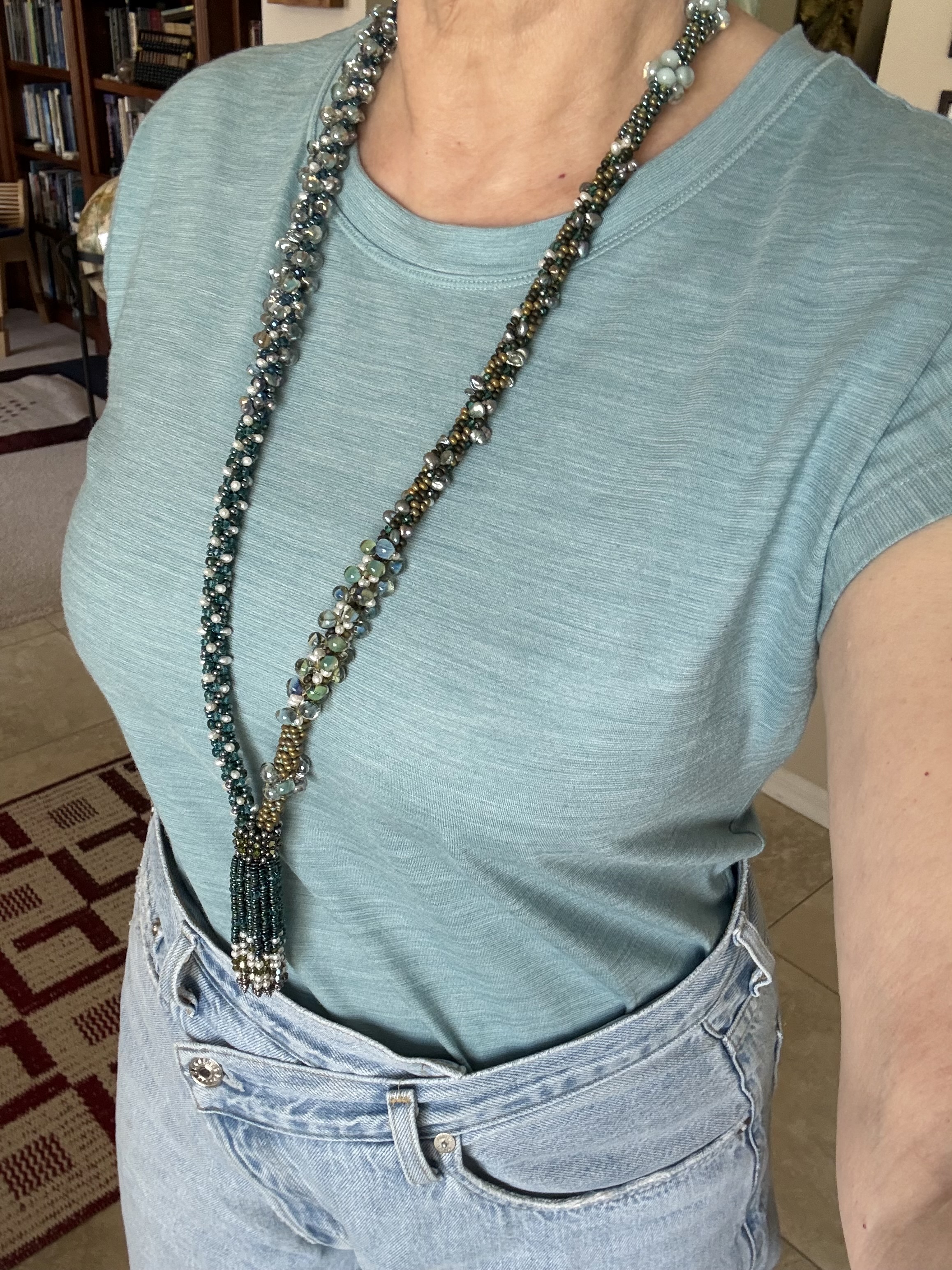I've been at a weaving conference studying kumihimo (Japanese braiding) with beads. Turns out that my teacher is a GIA certified pearl expert and braids with real pearls rather than fake beads. I learned a lot. But I bought one of the teacher's necklaces, because my work will never look like this. Freshwater pearls. Tiny round pearls in the tassel. Top drilled drops in the body of the necklace. And green dyed keshi in the body of the necklace.