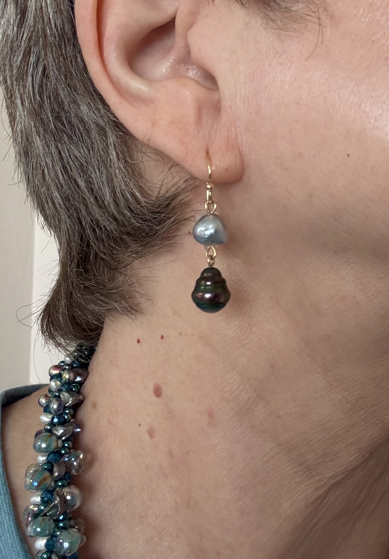 Today I have on my 10mm Hanadama studs (a lovely wedding gift from my Mom), vintage Assael Akoya strand from PP livestream, a wire-wrapped necklace of natural Tennessee river pearls, and a keshi flake strand I bought at the Tucson Gem show.
