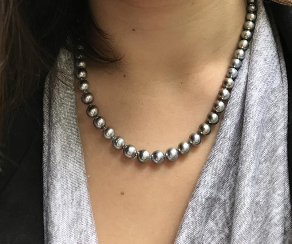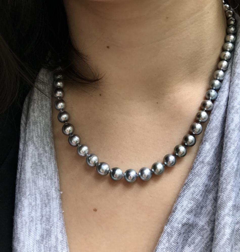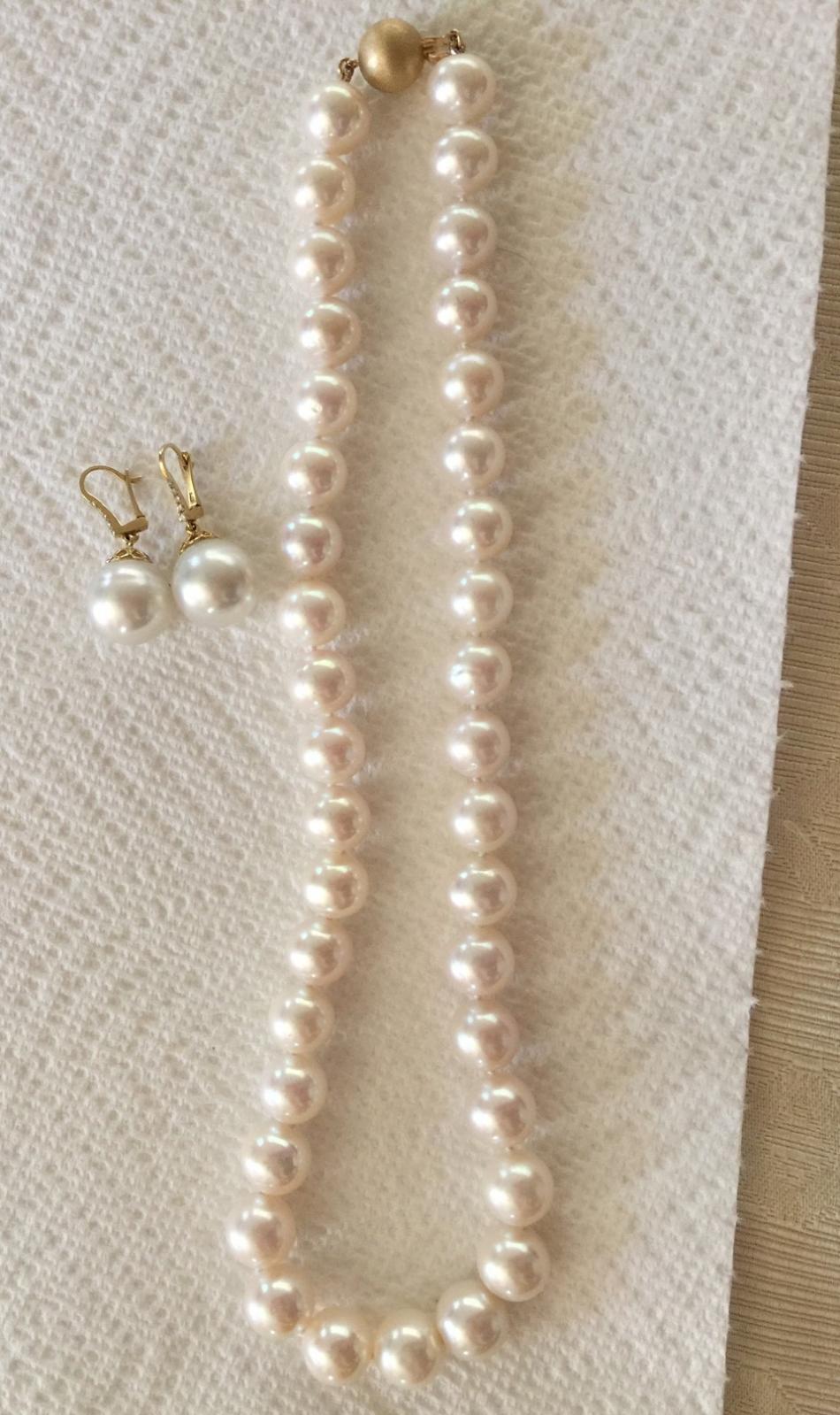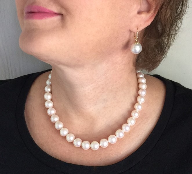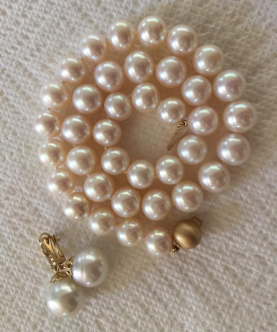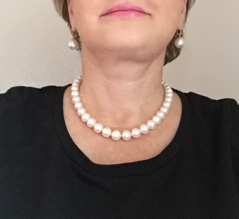 I'm trying to show how close a match the strand and earrings look when they're on even though the overtones are different. But my mirror shows a closer match than the camera is picking up. I wanted the look of a nice round WSS set (who doesn't, right?) but my budget was more in line with imperfect WSS earring pearls (slightly drop-shaped and slightly circled)) w/ a larger freshwater strand.