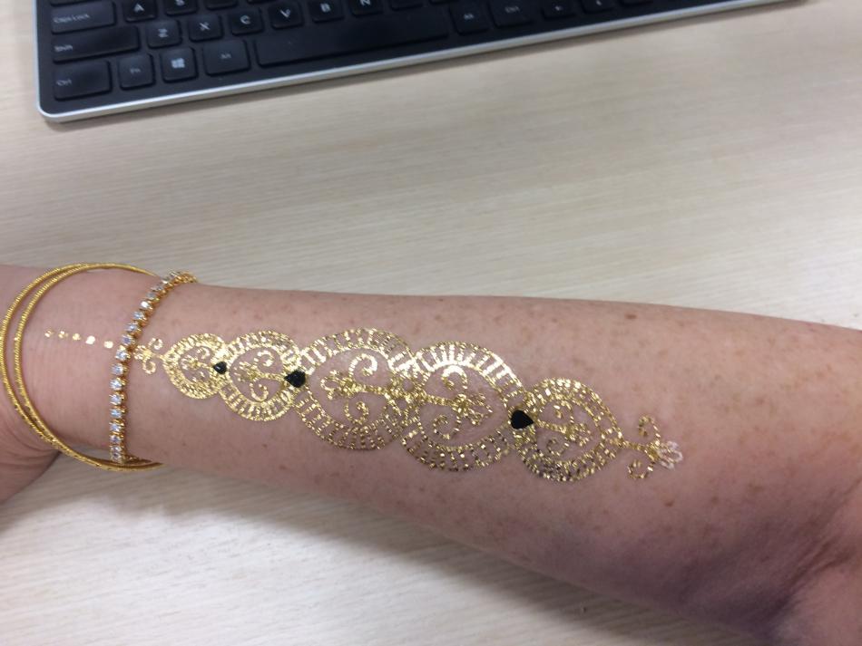 Instead of henna tattoos, they did gold press on tattoos. It matched my 22K gold bangles from Saudi Arabia.