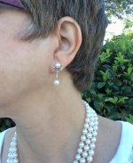 Today I felt like my grandmother's pearls needed an outing. So Nana's clasp with PP double strand of Freshadamas worn with PP natural white Hanadama rope, and Nana's drop earrings. The earrings have a bit of a blossom setting look about them. Also, Mom's pearl bracelet.