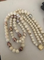 My angelskin coral and baroque freshwater double strand that I just posted in the recycled jewelry challenge thread, with an extra pic that actually shows the pearl colors. They're SO hard to photograph!