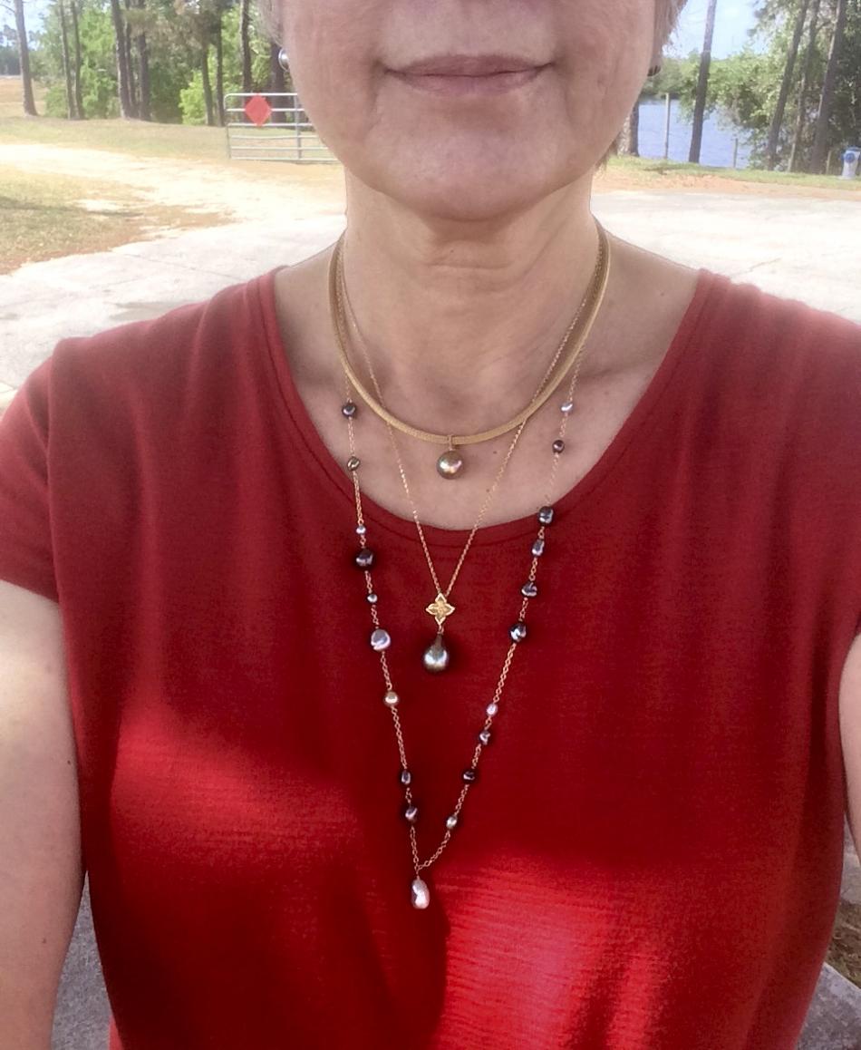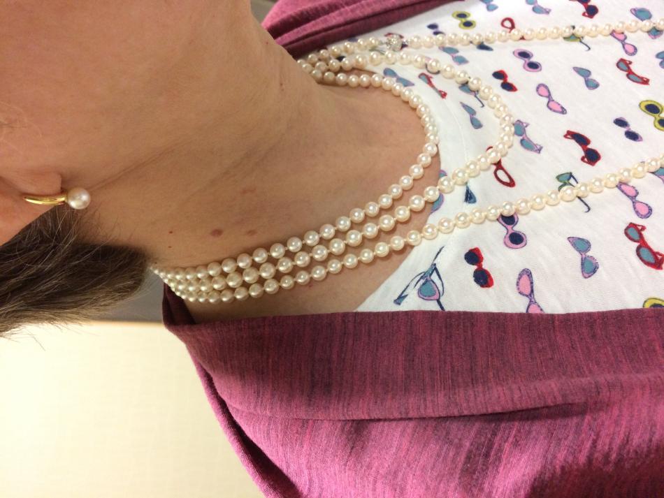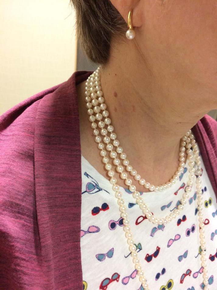 Today I wore a new combination. My Kasumi pendant from Kojima on my yellow gold knit choker. La Perlagrina from Kamoka. And my Tahitian keshi necklace from Kojima. Topped off with my black and white Tahitian stud earring sfrom Kamoka.
