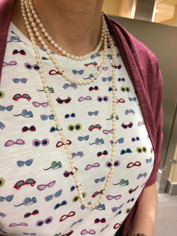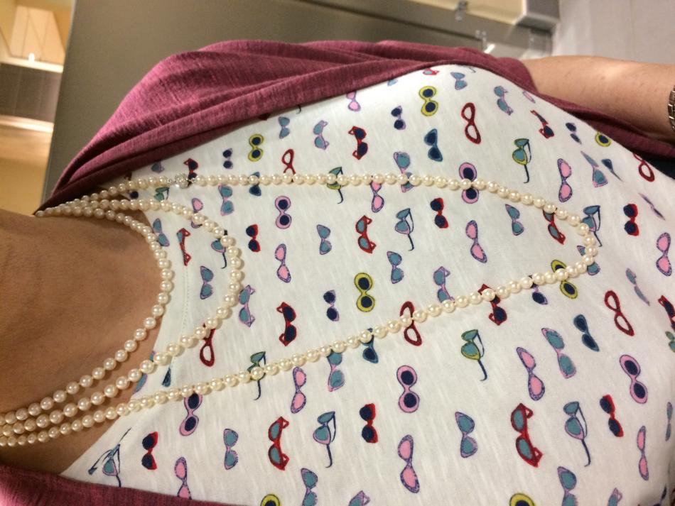 BWeaves, Perfect layering on the cute t-shirts! Great suggestion from PD for helping your rope to relax. I hope you won't have to restring. A couple of other ideas: let the pearls run through your hands as you apply some tension, also roll back and forth against your thigh as you apply outward pressure. I'd give it a few more wearings and hope it won't need reknotting.