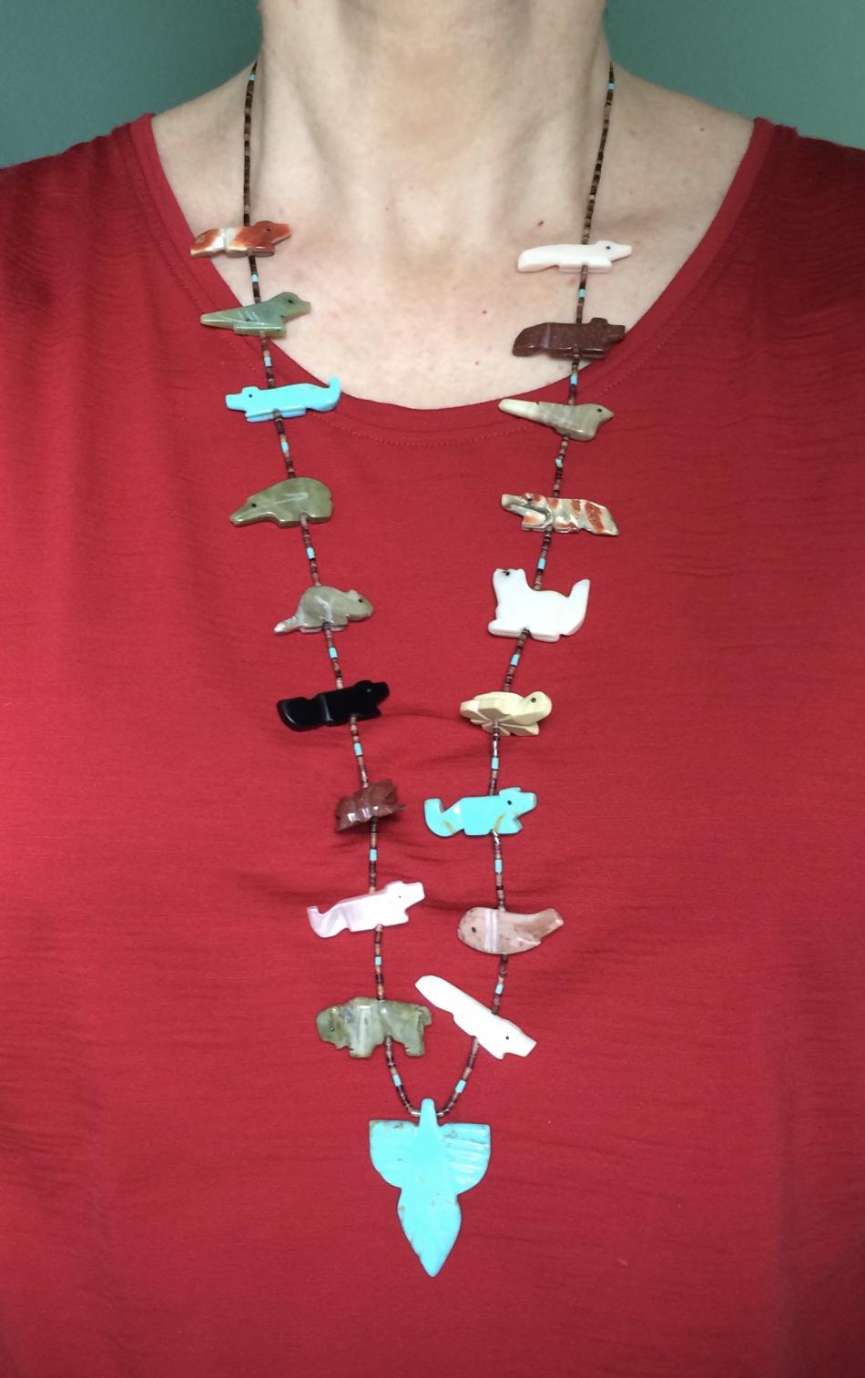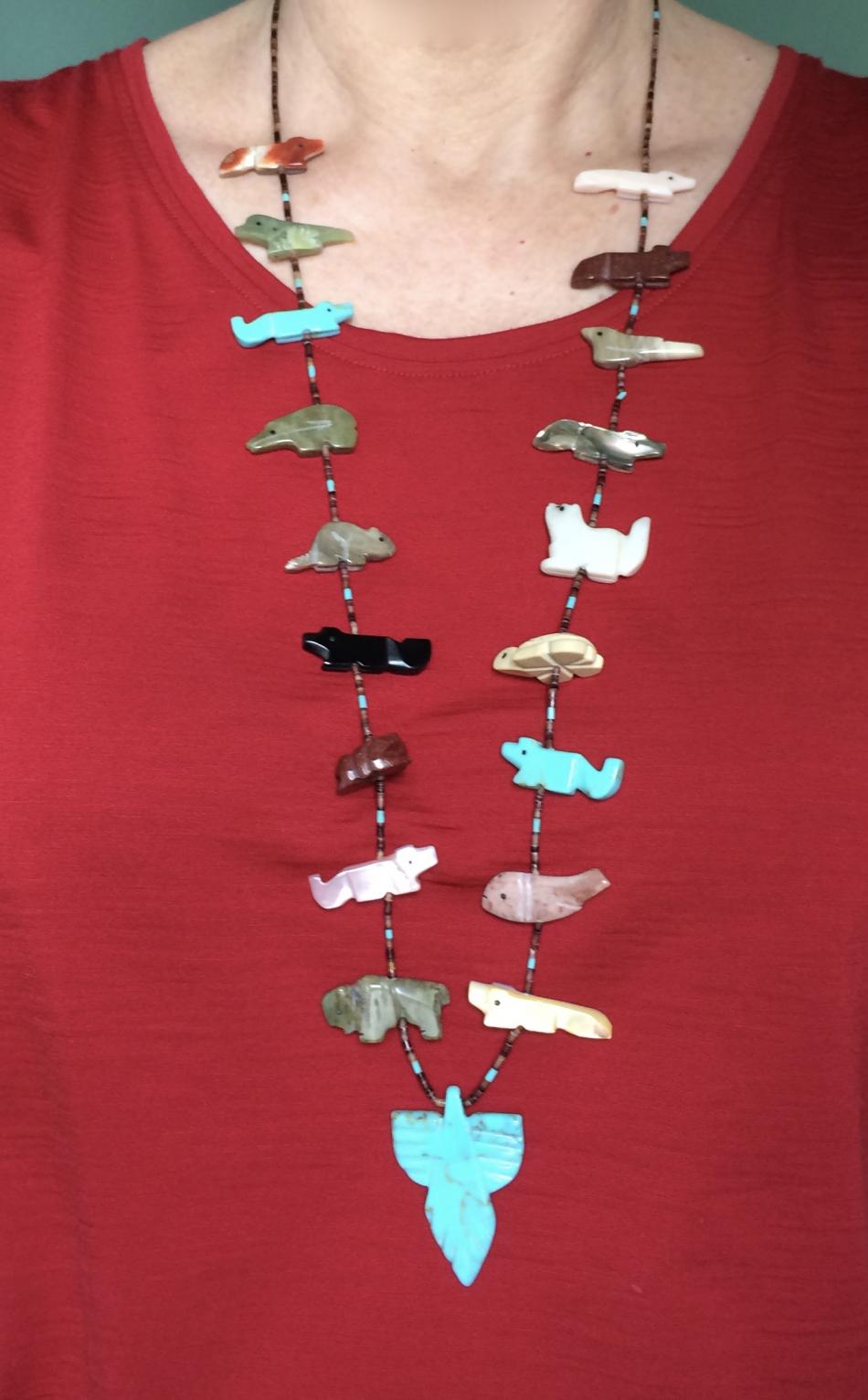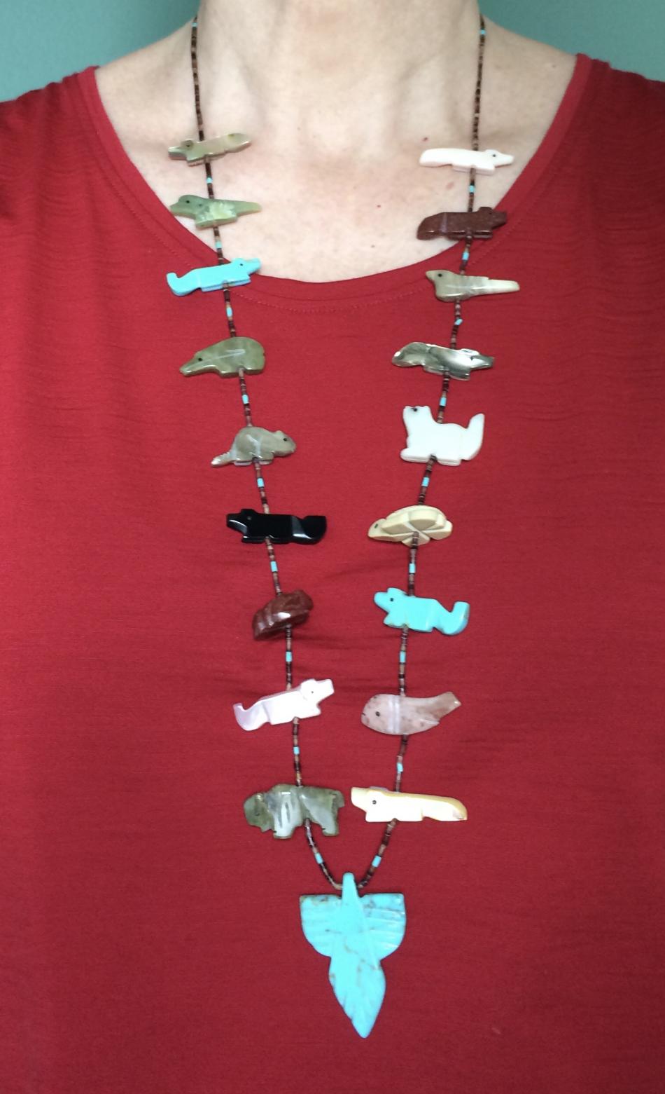 And now for something completely different. Native American Fetish strand. Some of the fetishes are carved from shell, but interestingly enough, the backside of the shell is the right side. At least when I wear the necklace, the shell fetishes always flip so the mother of pearl side is towards my body. In the top photo, the top left fetish is on the wrong side, and on the bottom photo, I've flipped it so it's pearl side up. I left the others pearl side up for the photo, although the bottom right one is wrong side up.