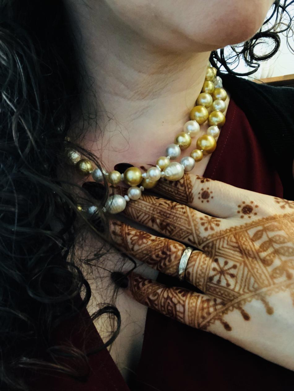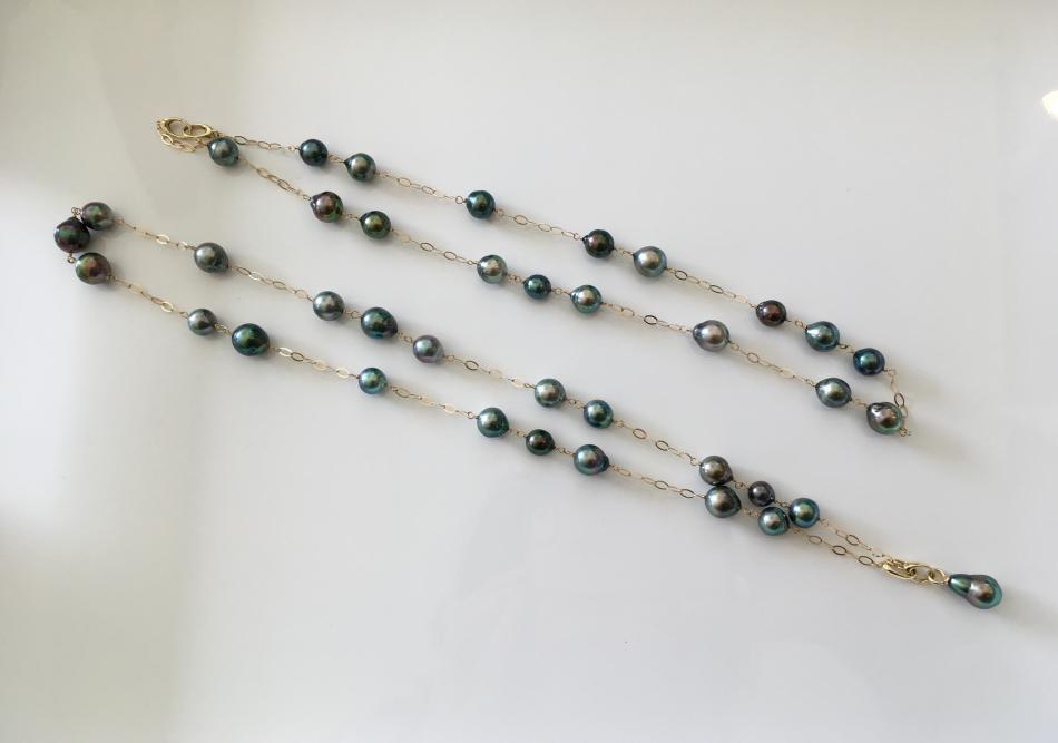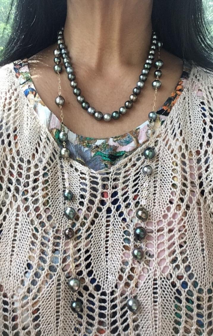 I absolutely love you in that blue striped outfit, Jeg! That's so summery and breezy and looks perfect with the pearls! And I'm in awe of the tiny akoya and keshi strands. Were they knotted between each pearl? If so, I tip my hat off to the stringer! They are such a beautiful combination. I've got some keshi and have them out now and was trying to think of what to make... may have to copy this, although I'm not sure my hands are up for something this tedious today.