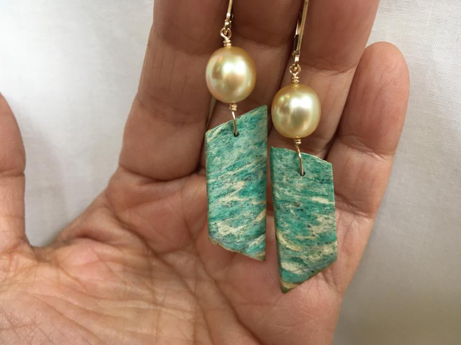 Summer Rainbow and Winter Snowman earrings (Kojima). Greg Who (Kojima) hanging off a pistachio akoya necklace from PP. Ombre' tin-cup from Kojima. Sea of Cortez ring in rose gold from Douglas and PP.