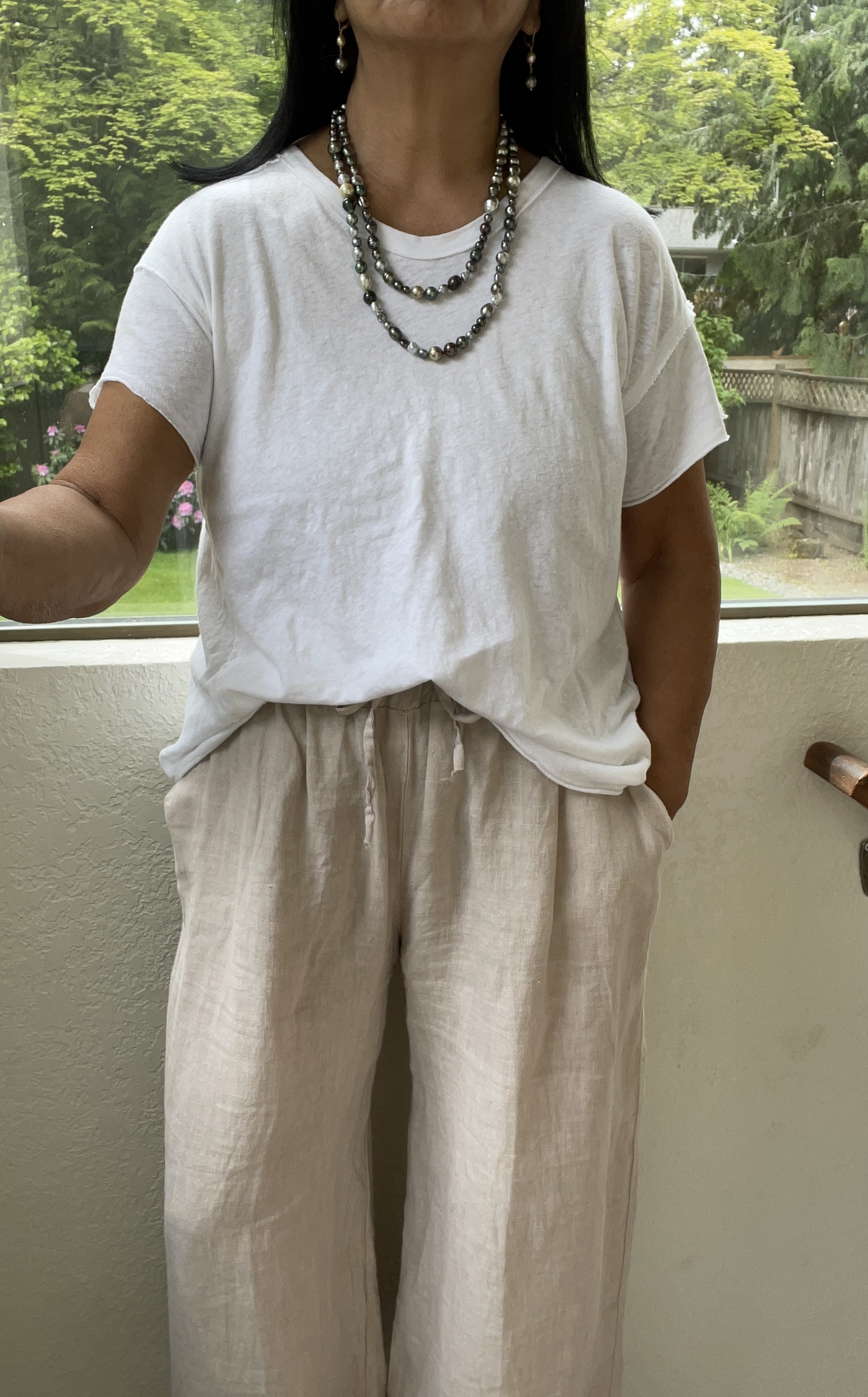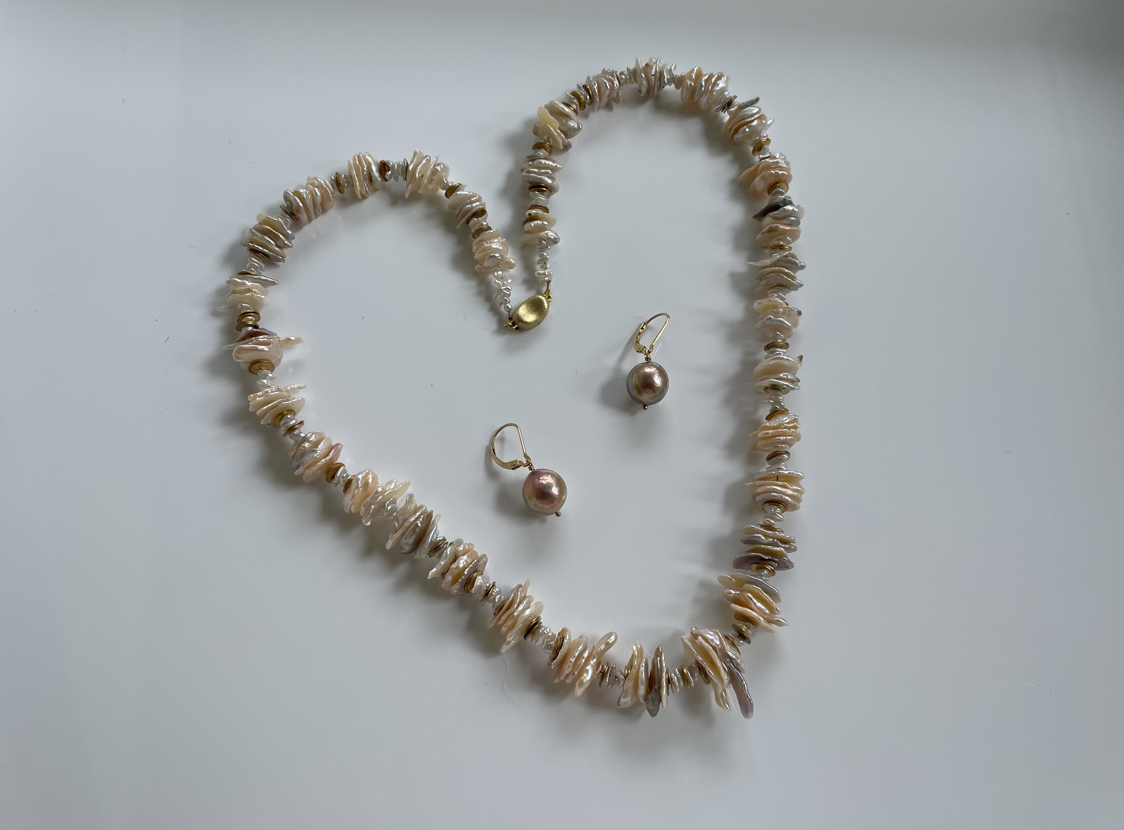A strand of Akoya and a pair of studs from Takahashi Pearl, with two baby Akoya and Akoya keshi with pearls from Hong Kong (thank you for introducing me to this farmer, Jeremy!), and a Japan Kasumi ring worn as a pendant from Kojima.