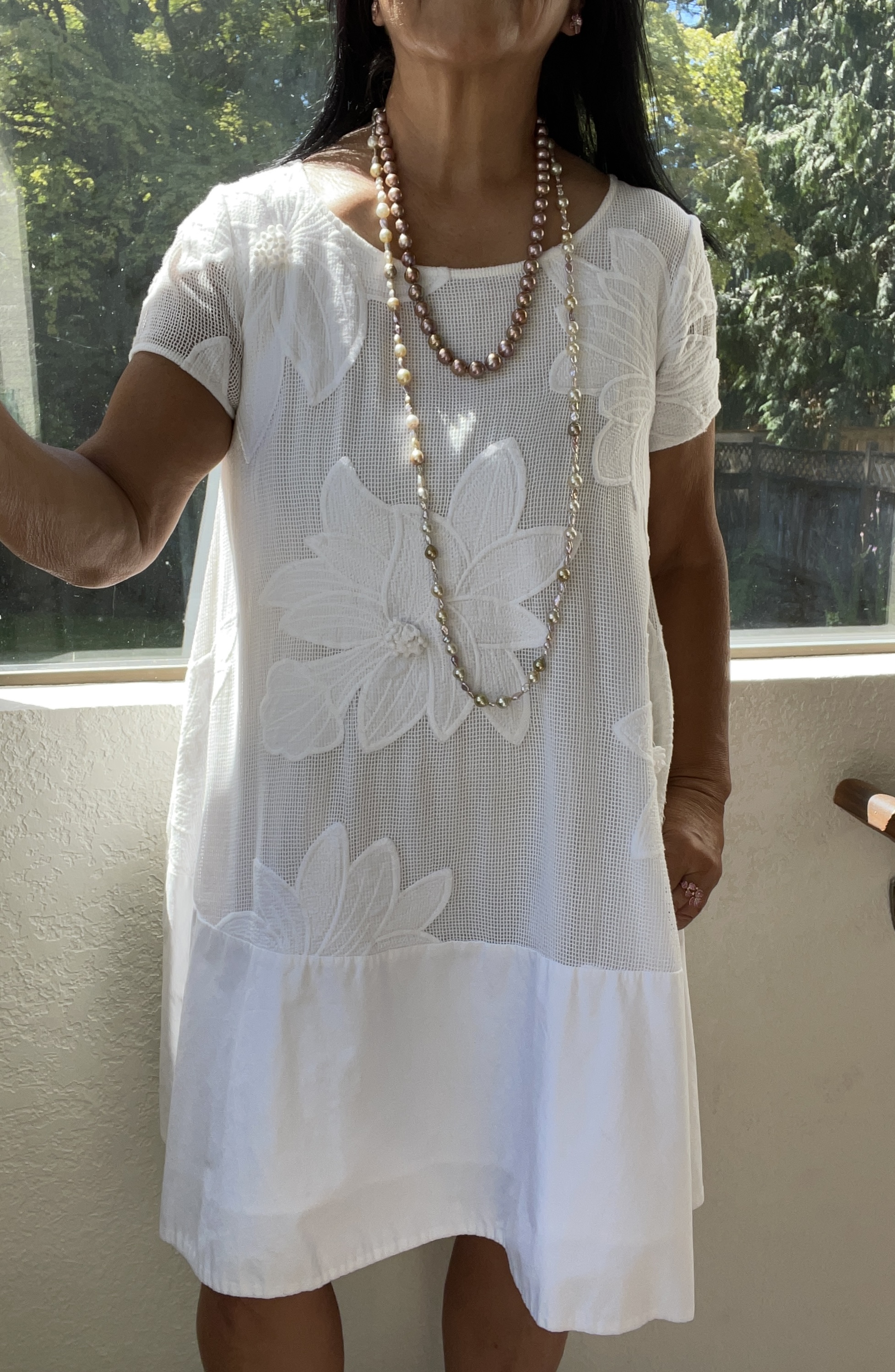 I live in this. At home. More accurately, Hawaiian shorts. Because my dog sheds like crazy, I don’t wear street clothes around the house. The pearls I have been living in at home are a bracelet I made with silvery blue Akoya from Druzy, and my large (10.5) baroque Akoya studs from Takahashi Pearl.