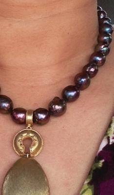 a strand of big ol' bumpy white pearls mixed with little metallic pinks, strung by me, doubled, along with my dark violet/blue faceted strand, with earrings, also self-done: