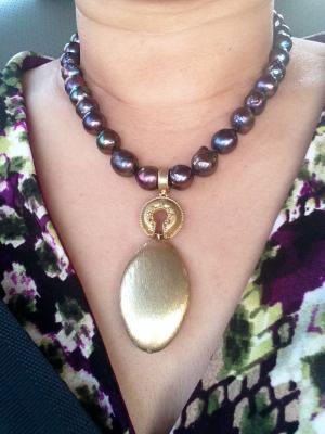what i think of as my fairy pearl necklace - made myself with teensy varicolored seed pearls with "keshi" interspersed, dainty gold chain accompaniment, and one gigantic blister pearl as centerpiece (baroque metallic stud visible as well).