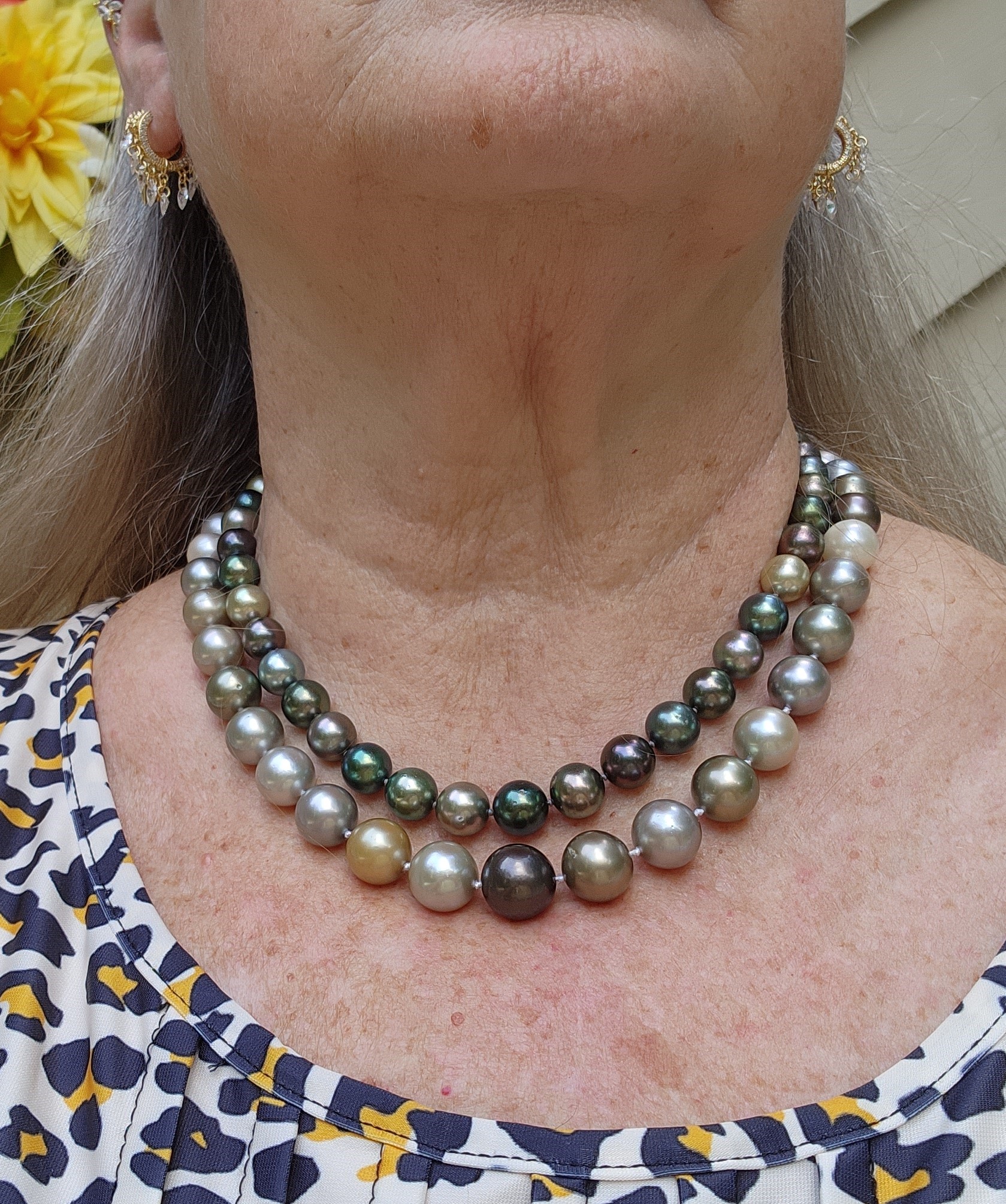 I'm wearing Spring Petals pendant from Kojima on my pistachio baroque akoyas from PP. It was the only strand at Ruckus. I wish I'd snapped up the blue baroque akoya strand that was in the same bag, but I already had some amazing BBA's from PP that Hisano had found. Freshwater keshi tin-cup and matching earrings from Kojima. I was asking Sarah about this necklace over e-mail when it got snapped up by someone else. Another case of me dithering too long to make a purchase. Sarah made me another one, but her wire wrapper accidentally made it too long (26"). I said LEAVE IT, I love the length. Then I asked her to make me some matching dangly earrings. I love her long earrings, but I can't wear the really long ones, so we went back and forth on designs. I really like these. Light weight with a horseshoe finding that is really comfortable and secure.