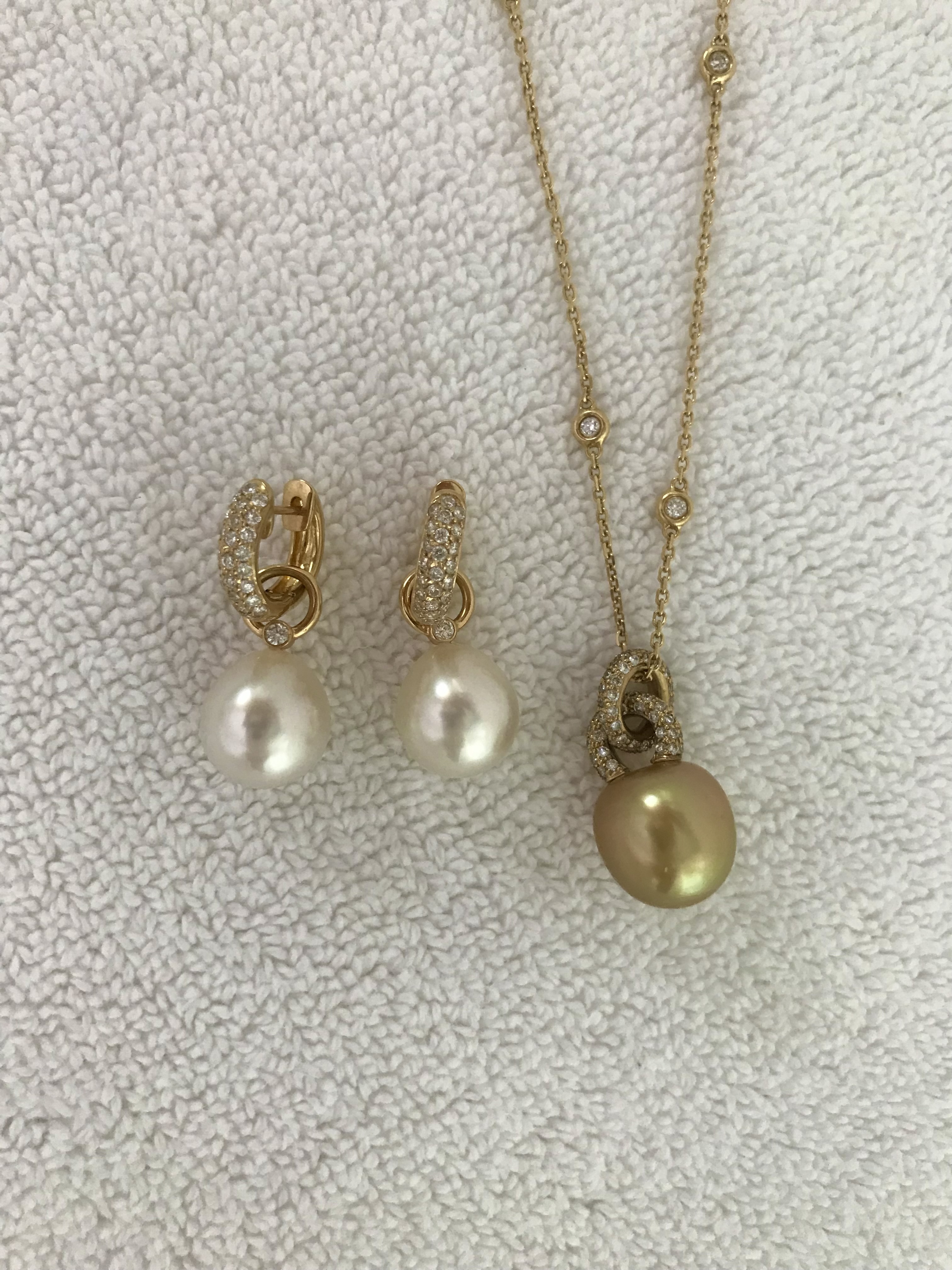 It's my favorite South Sea pearl color. Greenish gold with a hint of rose. The surface of the pearl is smooth. No flaws. Love the apple shape. The 18K yellow gold diamond chain is 17 inches long, but can be shortened to 16 inches. The diamond bail links are very sparkly and the diamonds go all the way around. I think my Mom's white SS pearl huggies earrings might be a good match to wear with it.