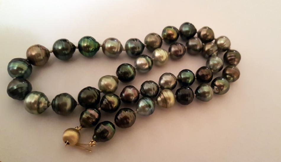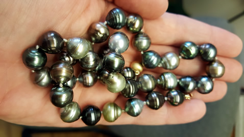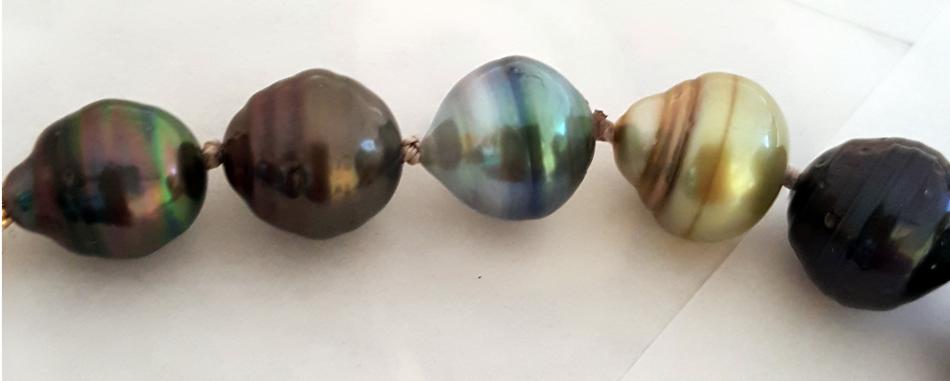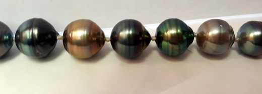 You have illustrated some wonderful points about why Tahitian pearls are so special. While there are some surface imperfections, the wonderful colors and rings draw the eye away from the flaws (minor as they are). You also help to vividly dispel the notion that Tahitian pearls are all dark green...and in fact come in a wide array of colors! I think baroque Tahitian pearls are my ideal pearl...you can certainly wear them when formally dressed, but they are also quite comfortable being worn with jeans and a tee. I really love this last set of photos you have posted...you have a gorgeous strand!
