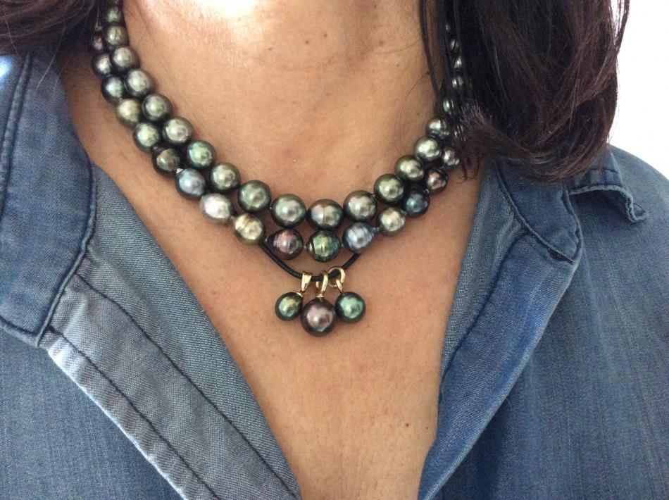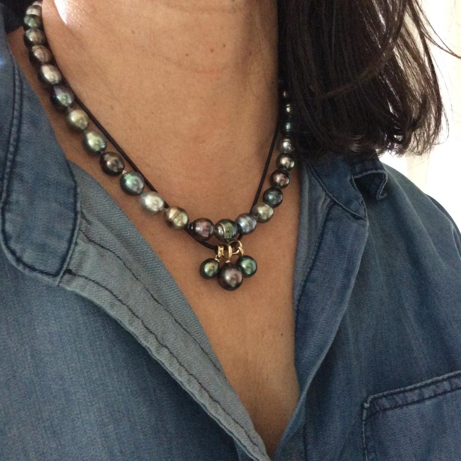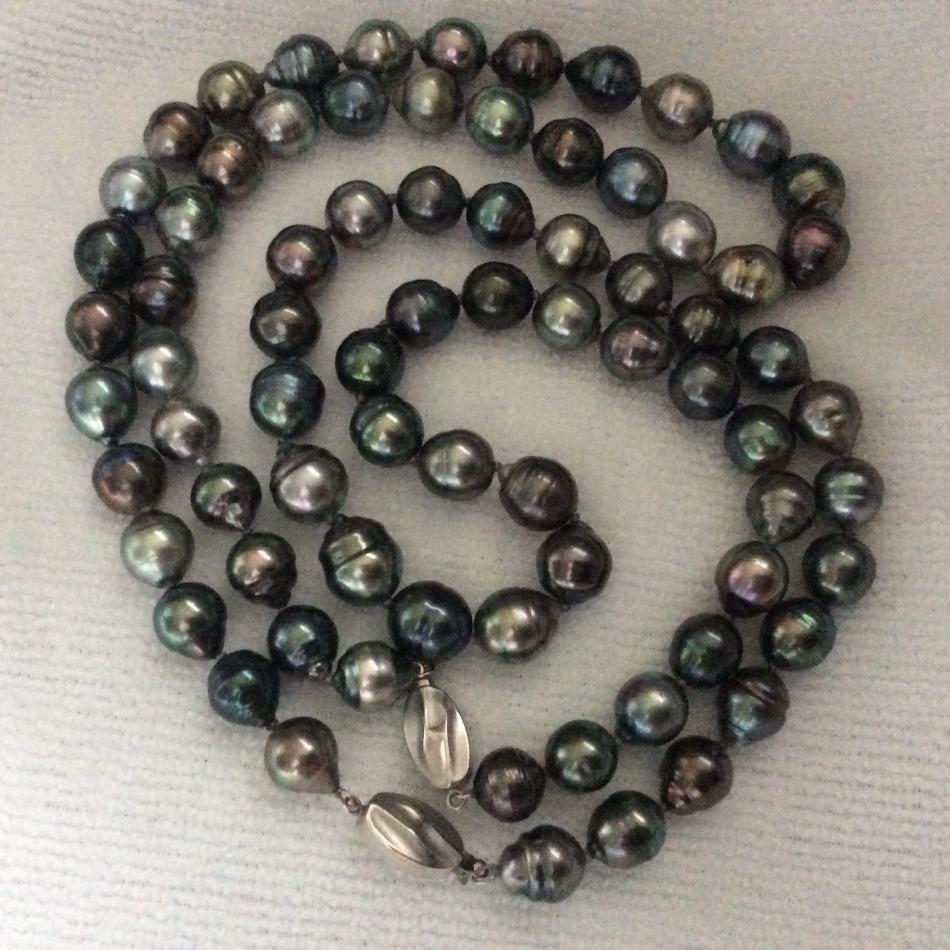 It reminds me of a strand I bought about a month ago on a website that sells everything from jewelry to housewares - and was listed as south sea pearls - clearly they're Tahitians, but I took a chance anyway. It plays nicely with my blue green PP Tahitian. At under 300$ per strand, Jeremy thought they were a steal for such colorful pearls... so I bought another strand!! Here it's shown with my blue/green PP strand, 3 Kamoka figs and fastened as a rope! All in various light..,