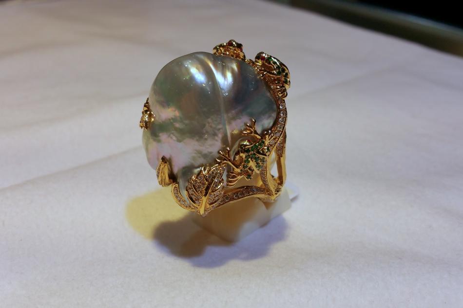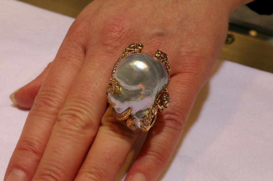 Emiko International has a well known flair for turning pearls into critters. This ring is a delightful example and one of the largest South Sea pearl rings I have seen.