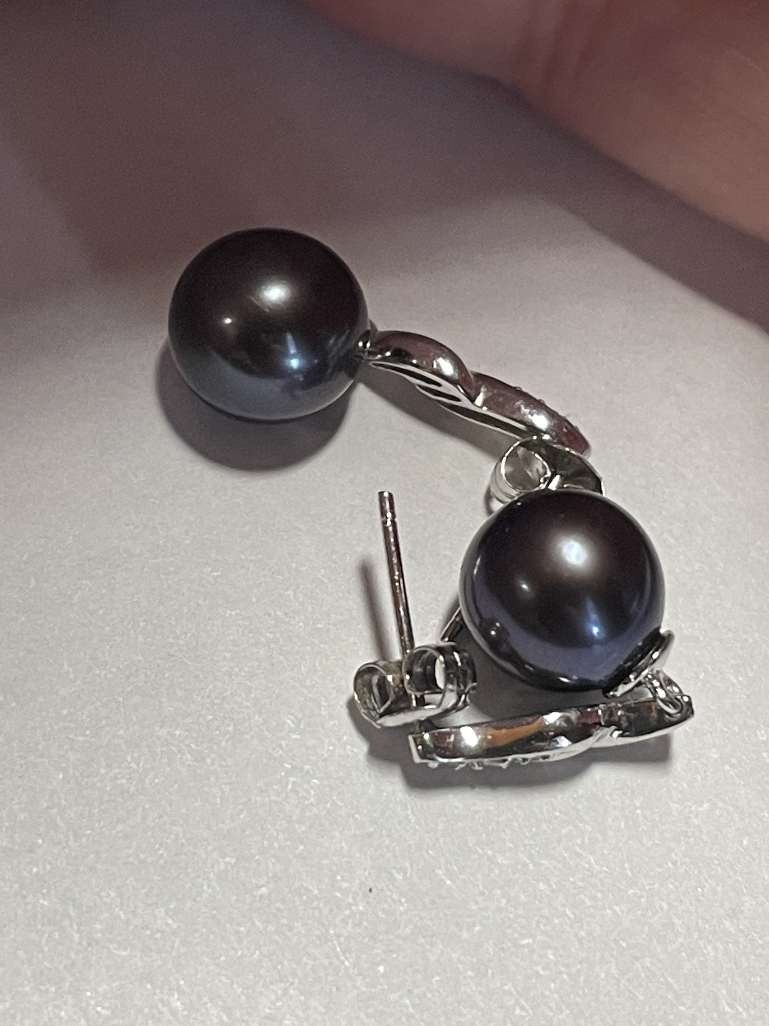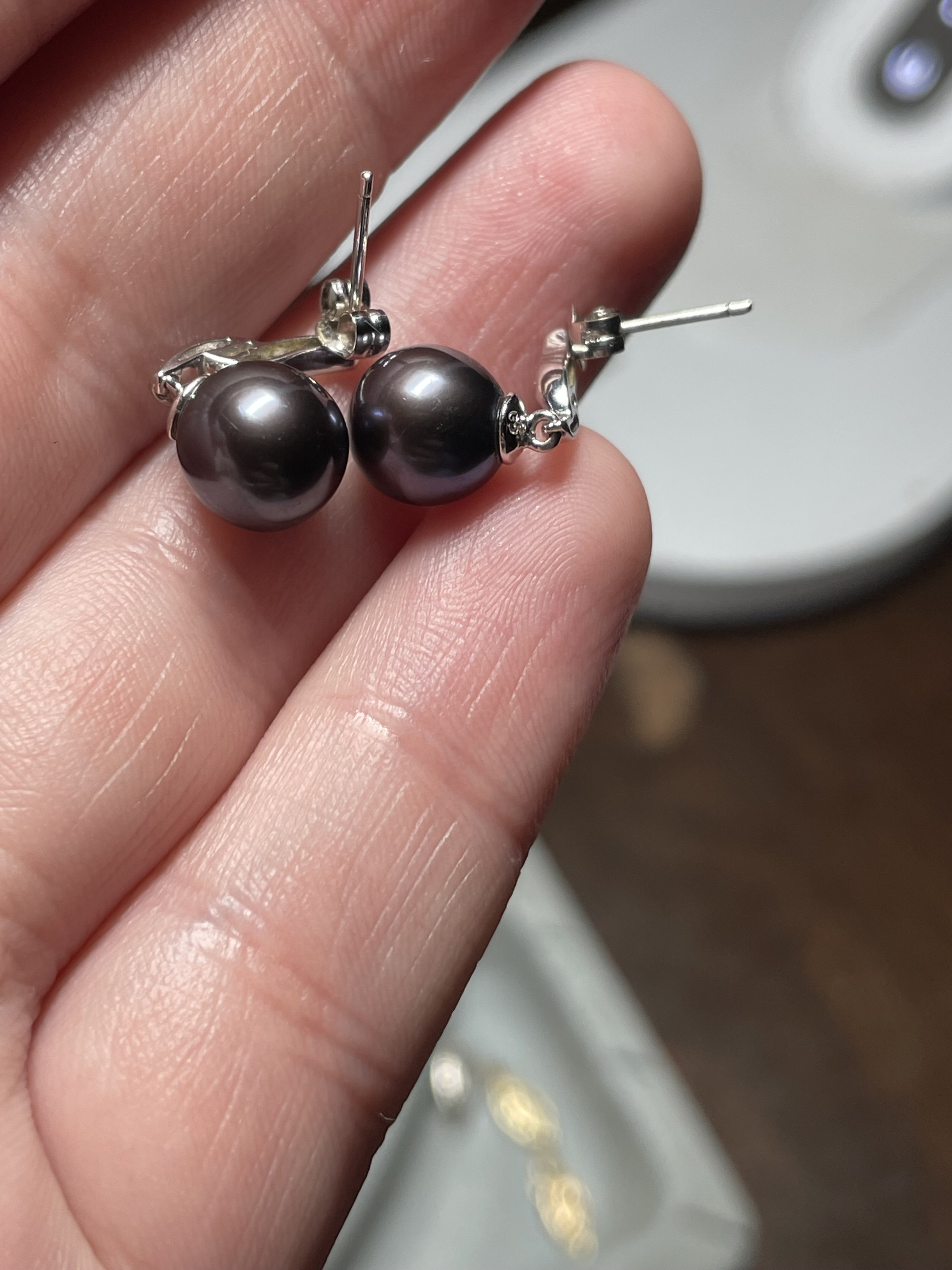 Many dyed freshwater have a purple/dark blue body color. Some Tahitians can also have aubergine overtone. Photos taken with pearls against a white paper towel might show the color more clearly. It looks like your camera may have focused on your hand instead of the earrings.