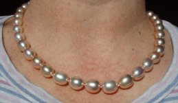 Now for photos! We all know how hard it is to capture pearls' color and luster, and I really did try-- but the slight color variations that are visible in diffuse light eluded my camera. Nevertheless these will give you an idea of their size and shape, and how they look on a neck.