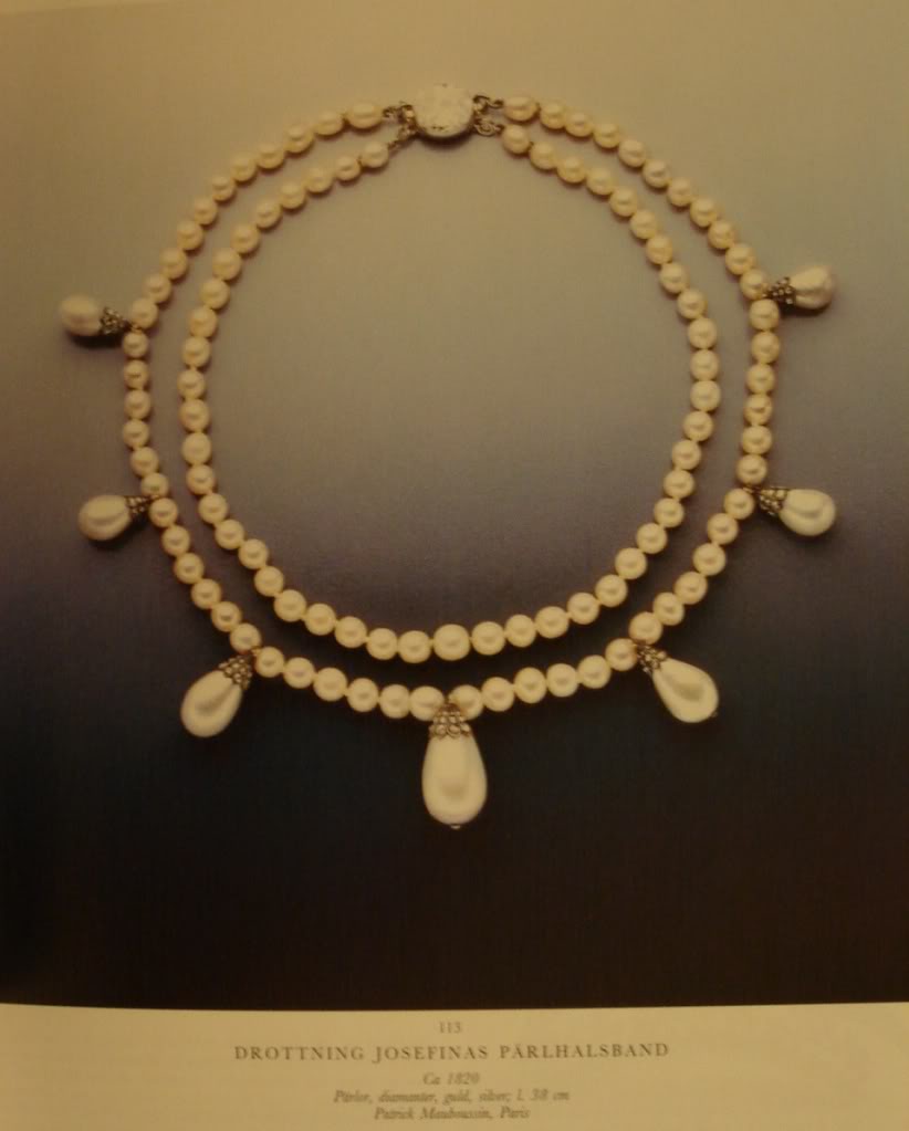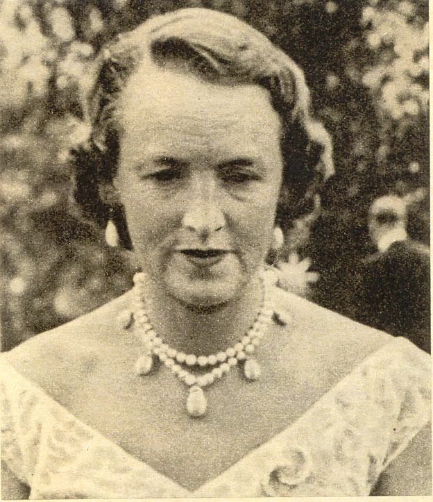 Ebba Bernadotte - clearly restrung: short choker length but with 6 pearls between each drop. Note the curious button shaped pear near the center drop. All the pearls seem slightly distorted in this image but there is one that is visibly narrower than the others.