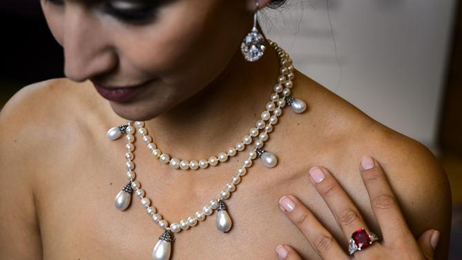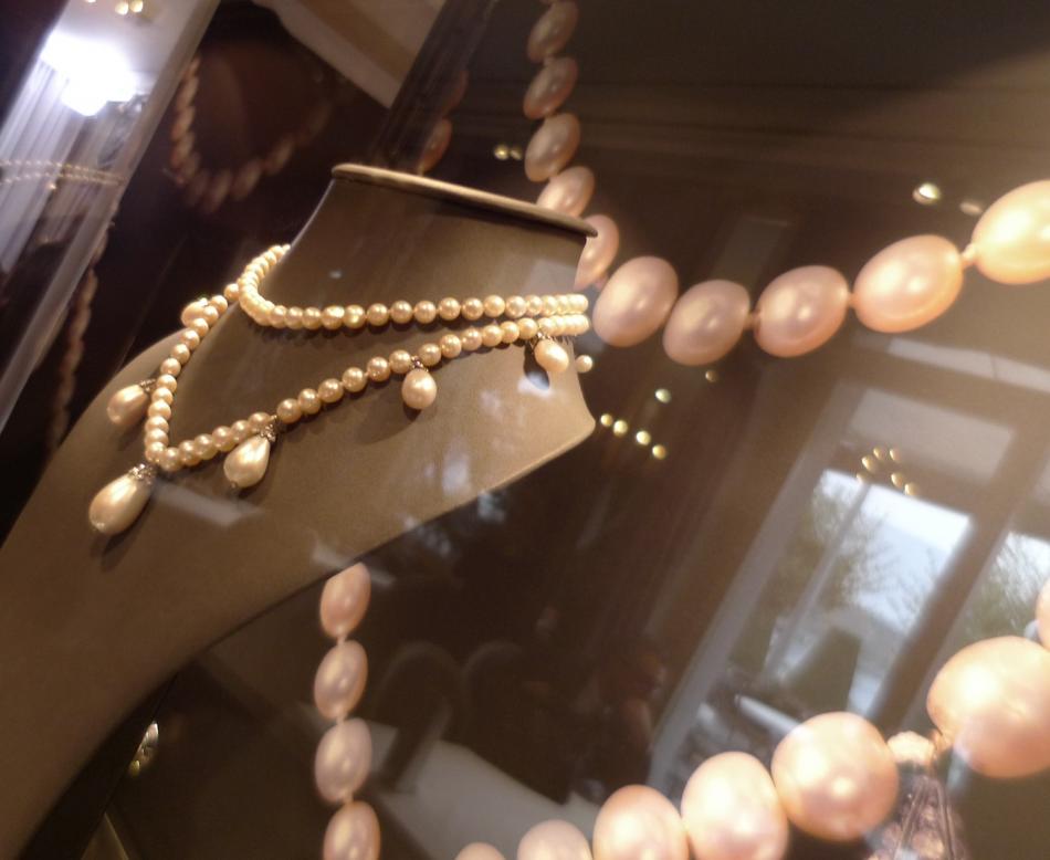 Countess Gertie Bernadotte - Back to a princess length with both strands of a similar length, with six pearls between the drops. The curious shaped pearl seems to be in the same place, two to the left of the center drop