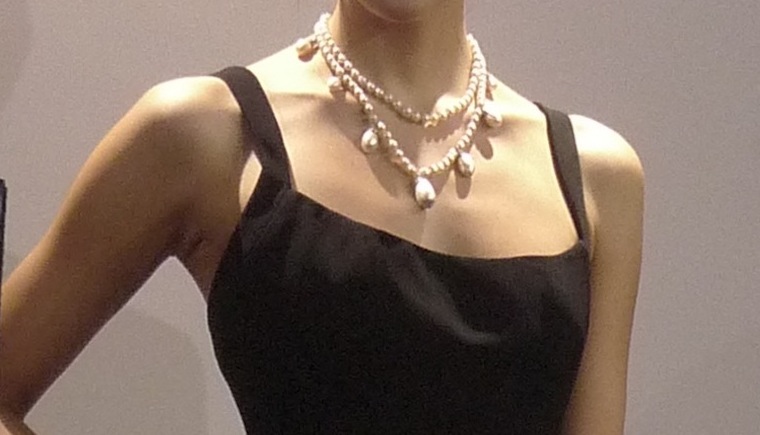 Christie's Catalog (1995) -here, we see the outer strand as much longer than the inner strand, still at choker length. The spacing of the drops is still 6 pearls (so extra pearls would have been added at the back, perhaps? Where did those hypothetical pearls come from?) and the funny shaped pearl from the previous photos isn't anywhere to be found.