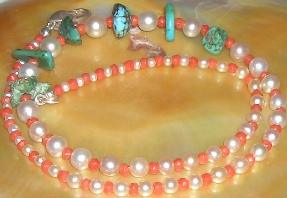 Here they are strung up with some of my childhood small hand carved natural coral beads made by a Navajo craftsman in the 1950's. Also Navajo carved drilled turquoise from another necklace from my childhood in the 1950's. I think this version has too much coral, so I am going to add more turquoise and pearls and make it as long as it was originally. Soon