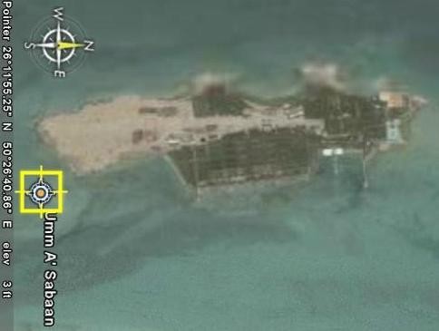 Here is a recent image of Umm a Sabaan island. It is about 1 mile by 1/4th mile about 100 acres. (not sure hoow one translates to the other, but I have heard both.