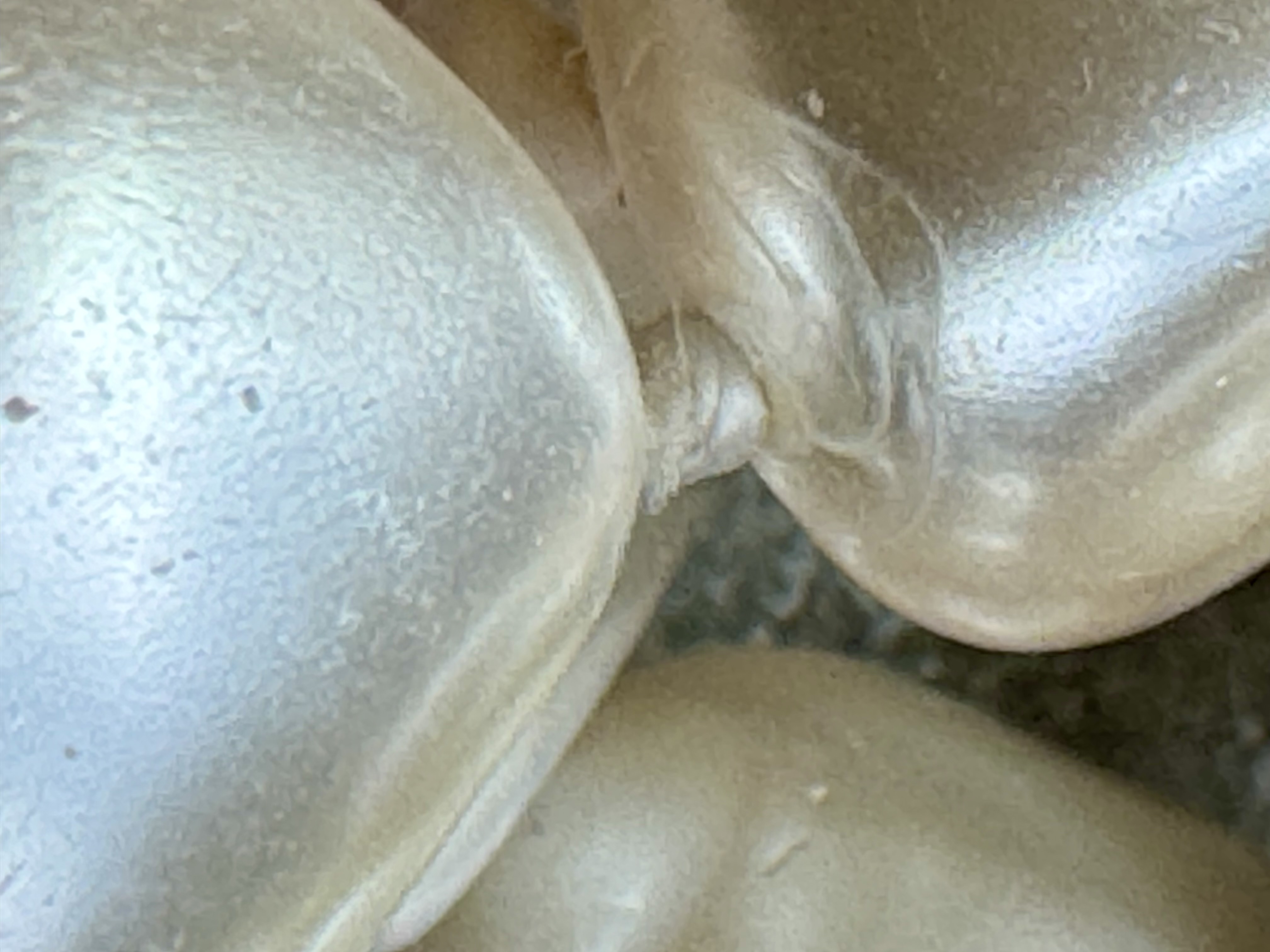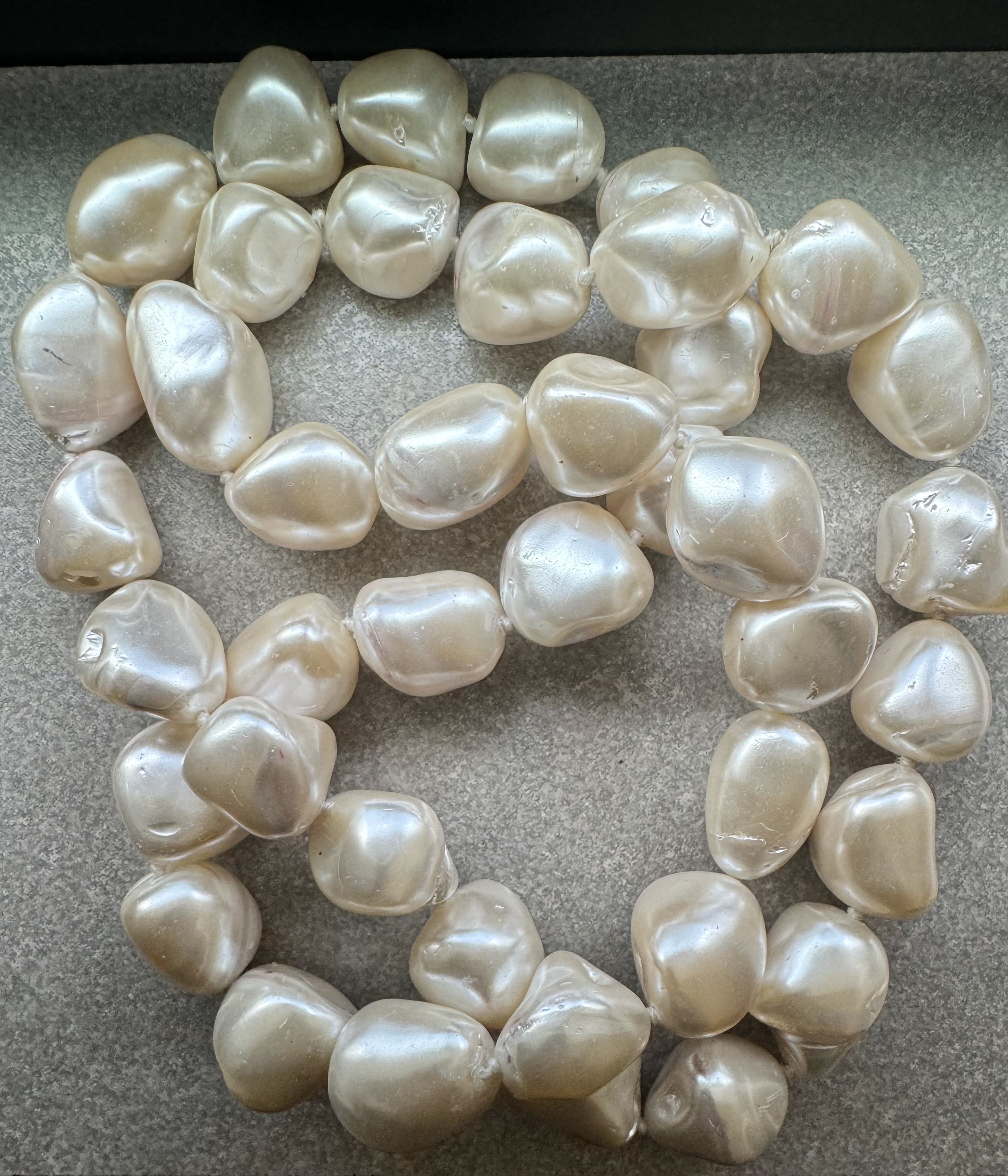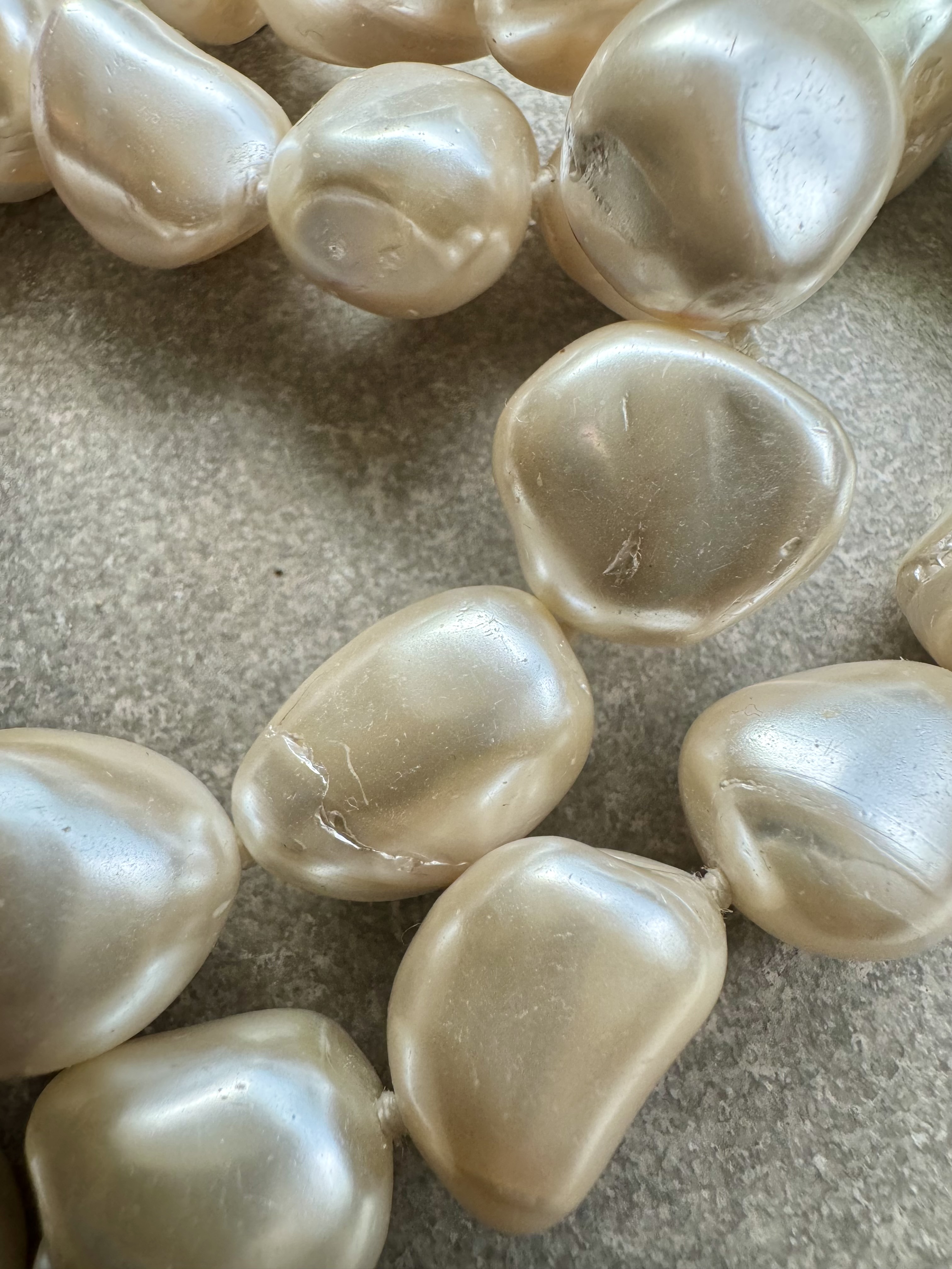 The weight, the shine and the sheer size and temperature left an impression on me they were striking. I was certain they were faux and was going to prove they were glass.. But I didn’t see any loss of paint even at the drill holes. I looked at the shape of the induvidual pearls and they looked pretty jacked as far as shapes and angles. They were very natural looking. And also very big. I measured with my caliper and they seemed to range from drill hole to drill hole 16 mm - 22 mm. And measured width from 14 mm to 18mm, the necklace was 76 cm around.