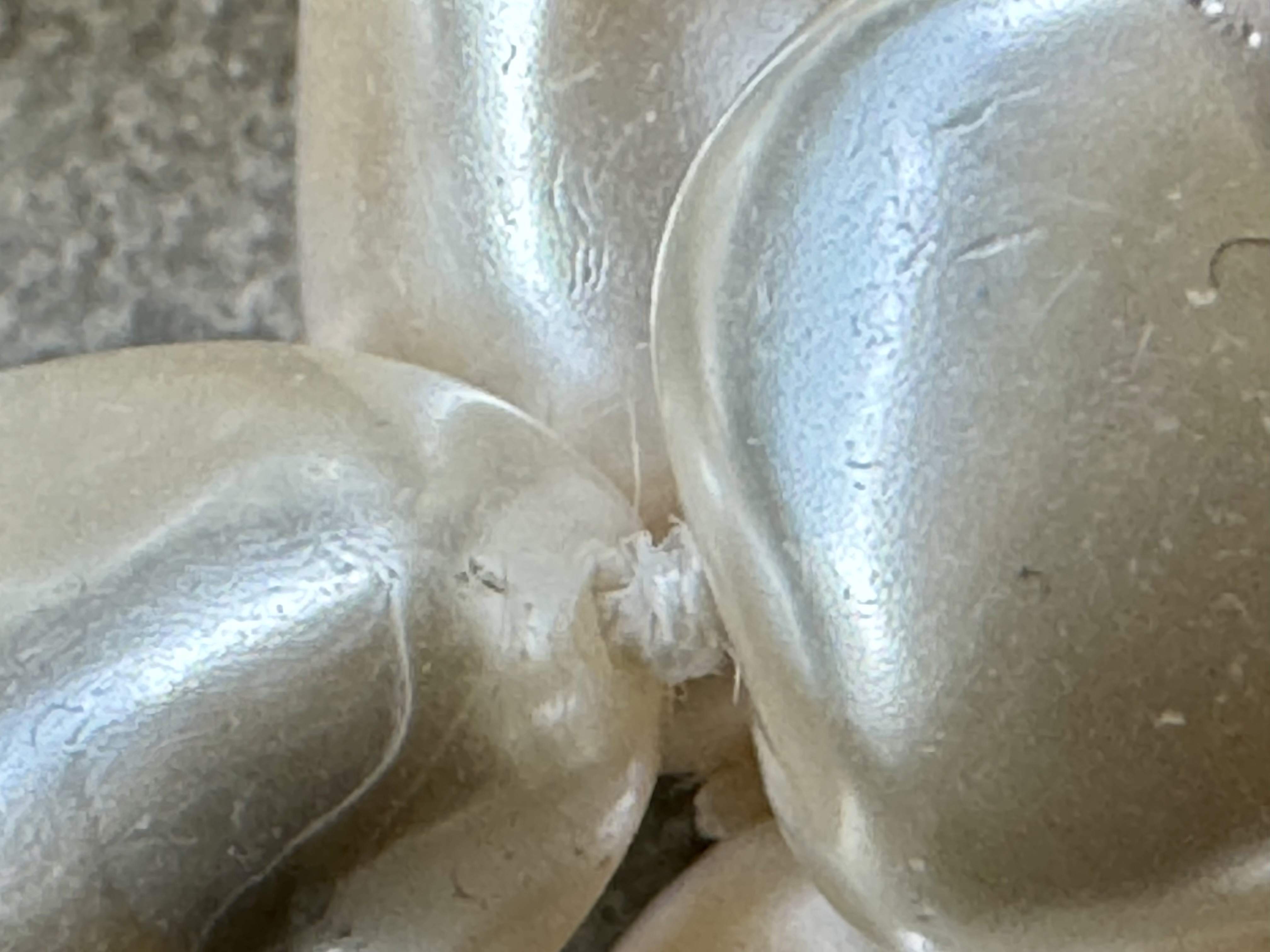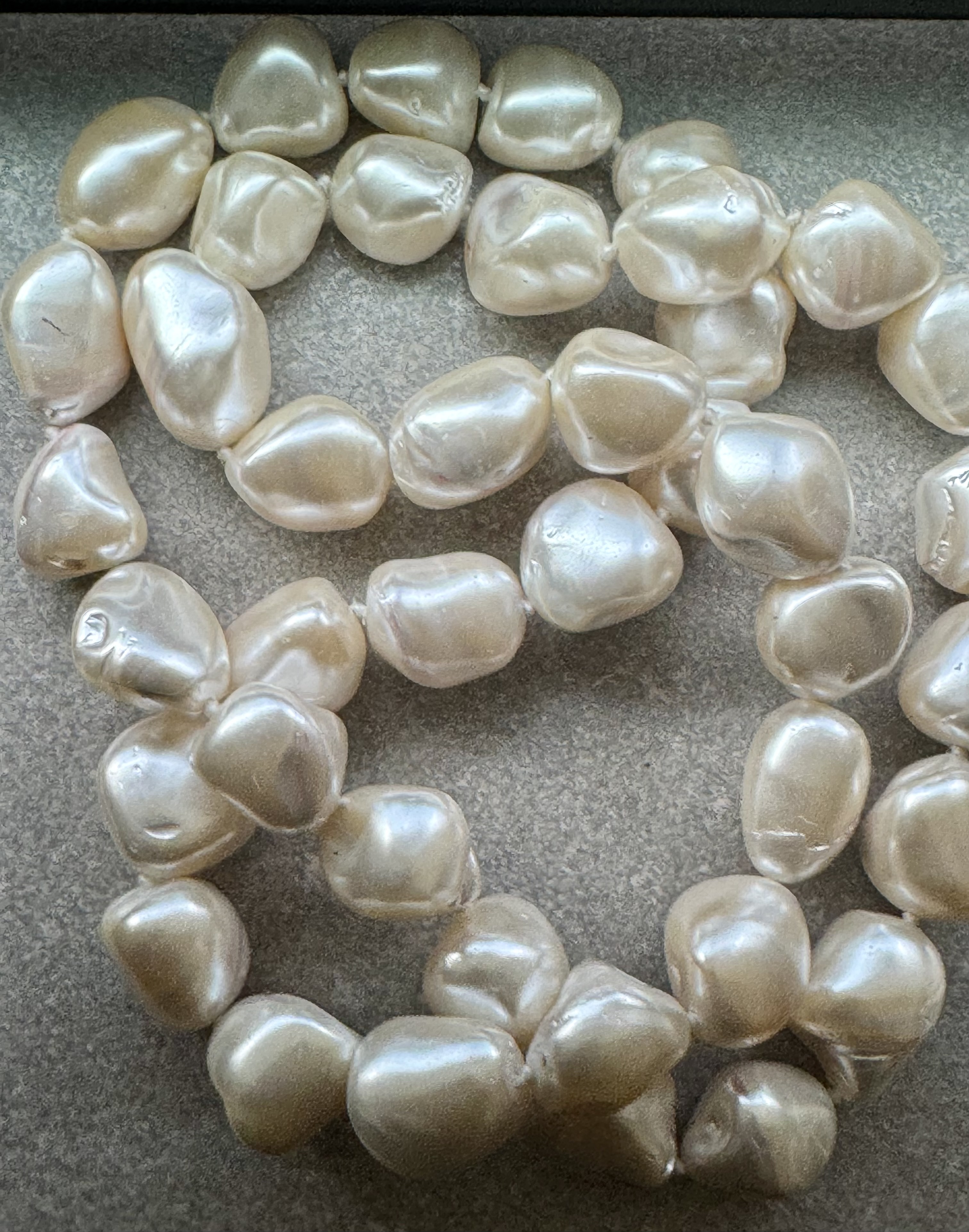 My parents go thrifting a lot and find some pretty amazing random stuff. I’m never surprised. My mom sent me a box of costume jewelry that ran the gamut of your trendy designer to high end runway. In a dust bag I pulled out a surprisingly solid and heavy pearl necklace. They almost felt like steel. I thought they were unusual but I figured they were some J crew nice statement necklace, looked for a mark and found none. So I just put it back and kept looking.