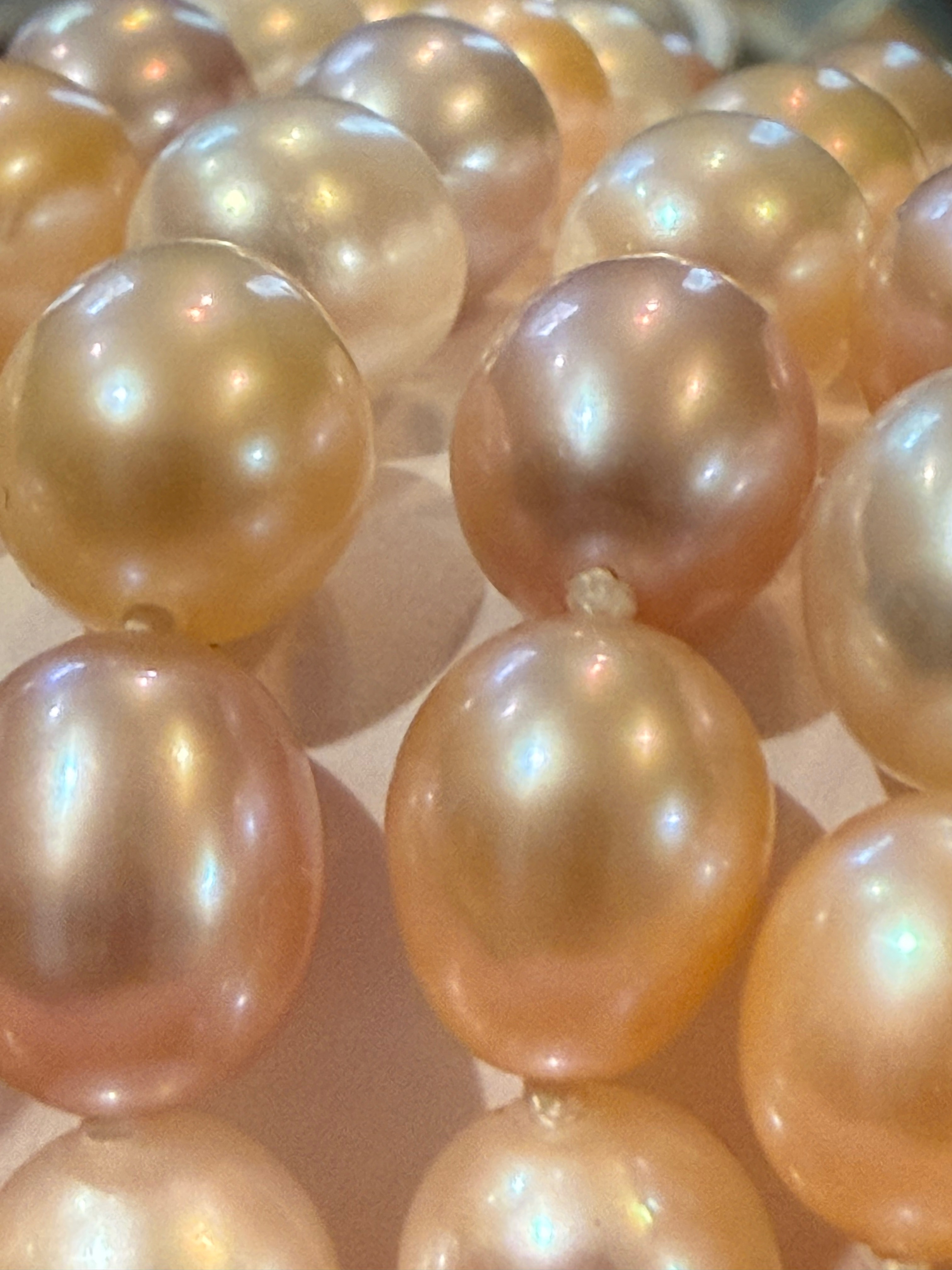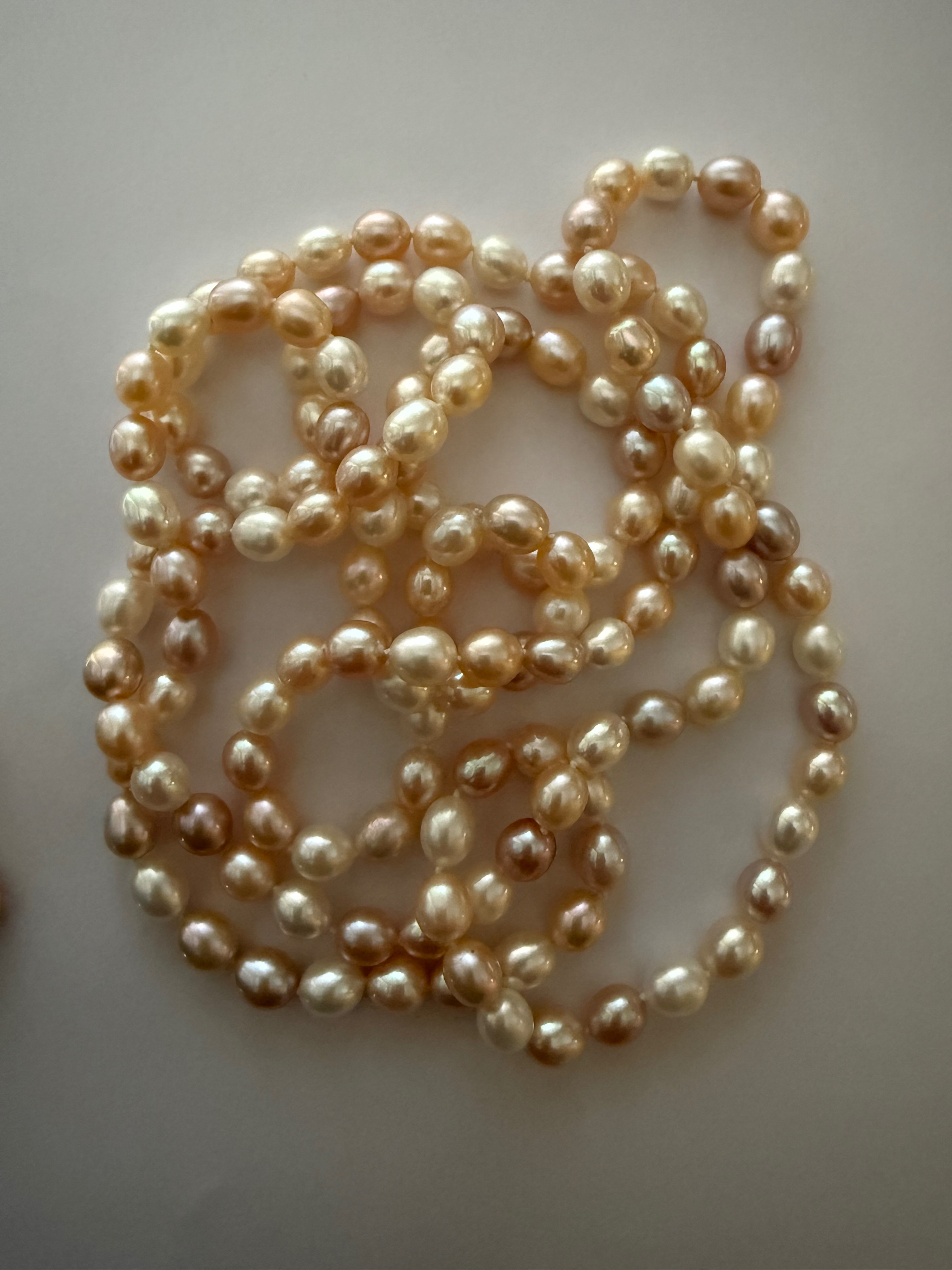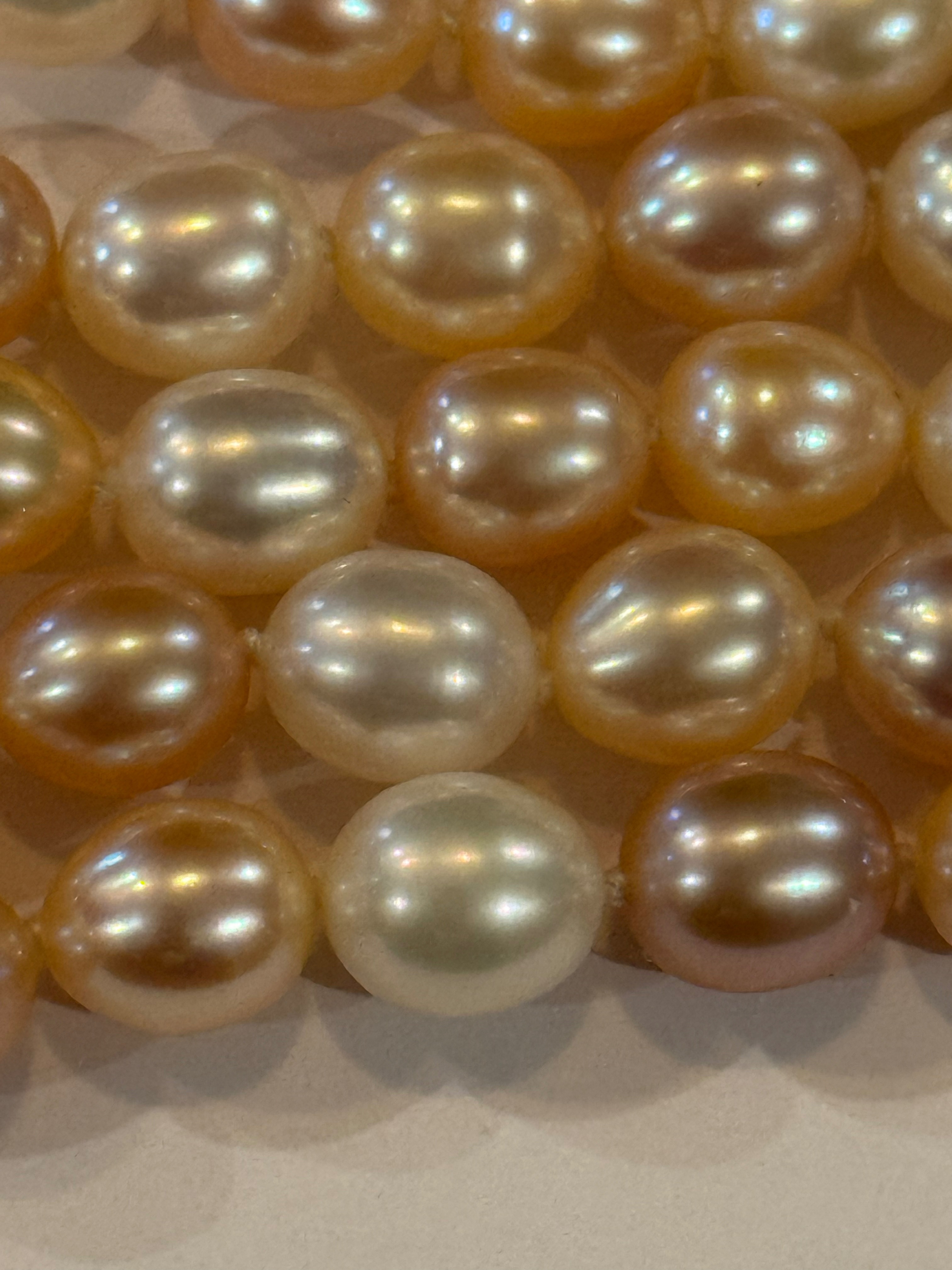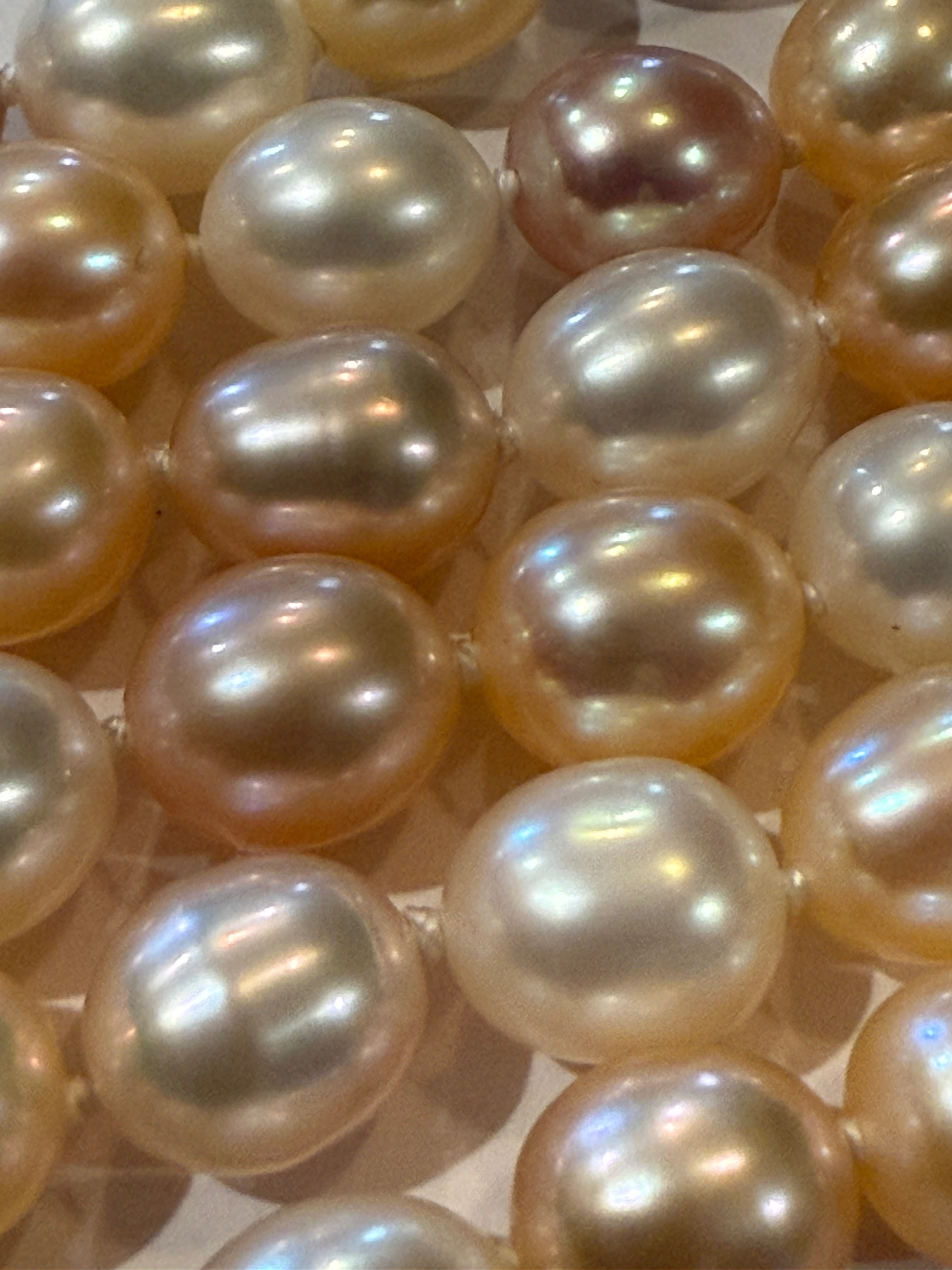 I found this strand at a local thrift store for $4.00. It is unmarked, each pearl is knotted and I cannot find a seam (beginning/end) on the strand. It is 25" in length so 50 inches if it was just the single strand stretched out. The pearls appear to be 3 or 4 different colors strung in a pattern. They kind of feel sandpapery when rubbed together. This thrift shop sells jewelry boxes/pouches separately and I saw a Maui Divers Jewelry pouch sitting in the pile and that is why I looked at the pearls. I picked this strand because it was heavy and cold, which is what I look for when trying to find authentic gem beads. I would appreciate any insight or input as to whether these are real.