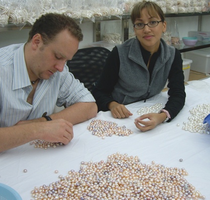 Well, we finished up a day early (and I say "we" because I brought Mia from my office) and I decided to start searching for large baroques. The farmers are currently harvesting pearls so it was actually quite difficult. They were not yet separated. We spent most of the day pawing through fresh harvests to find suitable pearls. We were literally lucky to find one that worked per thousand on the separator (large from small). We ended up with only about a kilo of pearls in the 12mm range (up to 14mm). The pieces that I put together this morning came from that bag of pearls. Unfortunately this means we will only be able to make 5 or 6 decently matched strands.