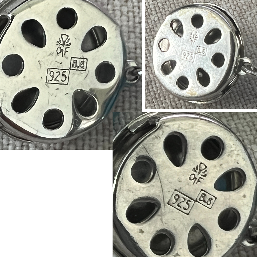 Both clasps are sterling, so are the catch chains. Each clasp is marked 925, B.6, and a mystery hallmark.