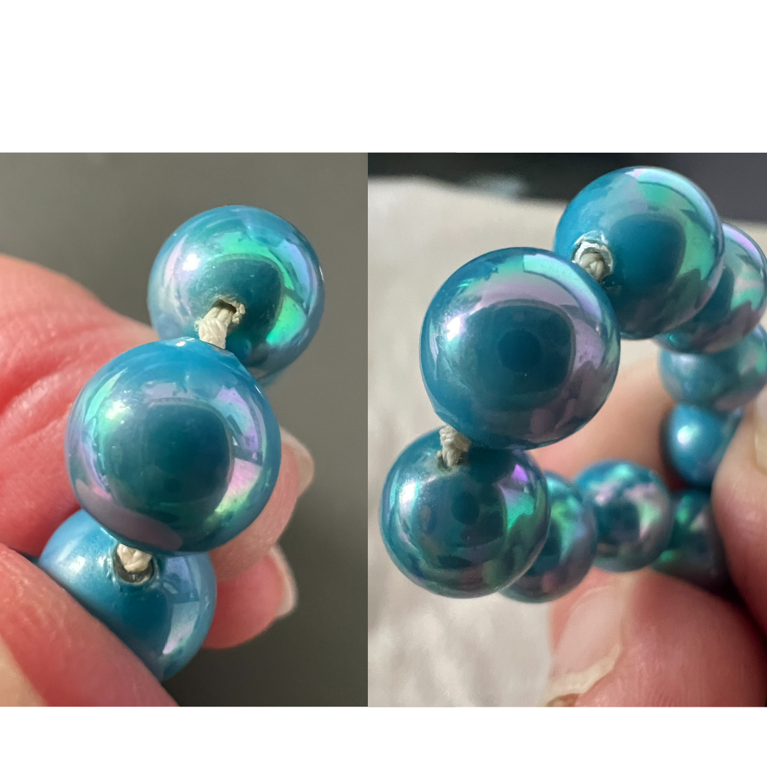 They are heavy, feel gritty and smooth! I don't know. Strung on white thread, with a knot between each pearl.
