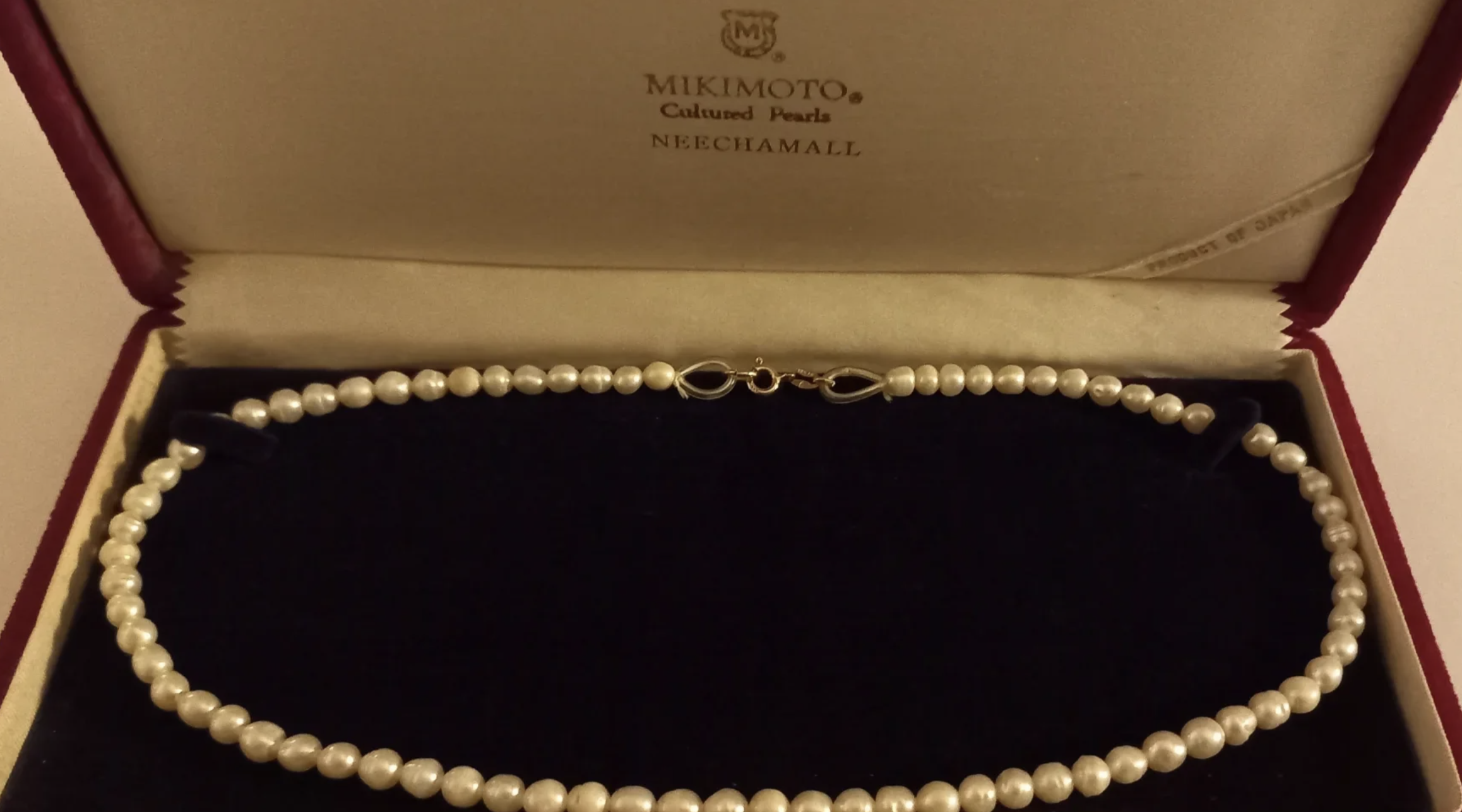 That's a really cheap looking clasp and a poor knotting job. The clasp is about the only way you can claim Mikimoto origin and you still can't trust that because the clasp could be fake or the pearls swapped.