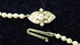 Hi all, I am currently looking to purchase a pearl necklace for my wife for Valentines day. She really likes vintage items. I found this strand of pearls in a mikimoto box at an estate auction. I have several reservations. The auctioneer informed me that the original owner purchased the pearls in Tokyo in 1954. However the images do not seem to show a stamped "M" anywhere on the clasp. The clasp also does not seem to be similar to any other mikimoto clasp I have researched. The diamonds have been verified as real. The threading? between the pearls also seems to be too thick. I plan on going to check out the pearls in person tomorrow and will try and get better images. Any help would be appreciated. I have attached several images.