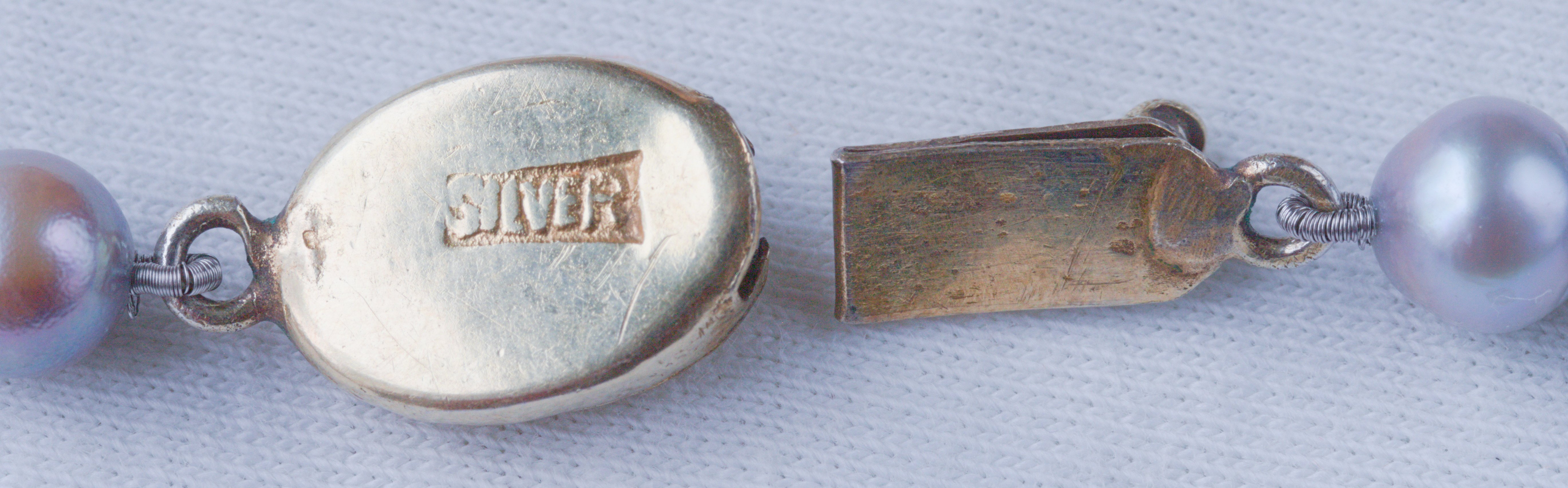 The necklace is about 41 cm long (on stretched-out cord). The clasp is stamped "SILVER", but has a yellowish hue (plating?) and a little greenish discoloration in spots (maybe from copper in the silver alloy, or maybe the clasp is not actually silver?)