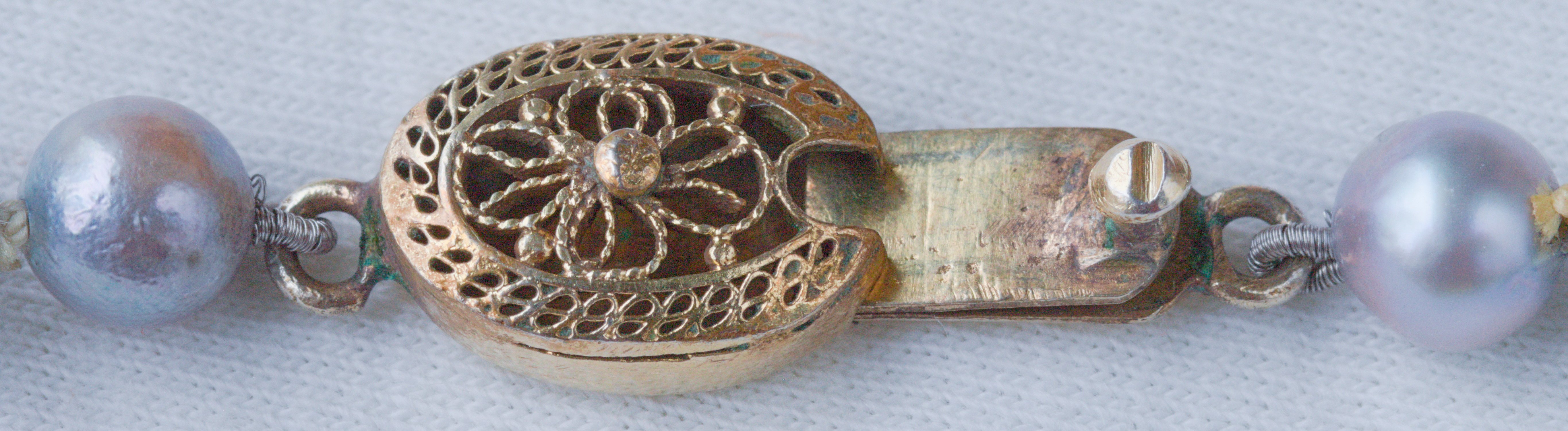 The bracelet is about 18 cm long (also on a stretched-out cord). The bracelet clasp is stamped "ACO 1/20 12K G.F.", so, gold-filled. I wonder if some pearls were removed from the necklace at some point to make the bracelet, since the clasp styles are so different.