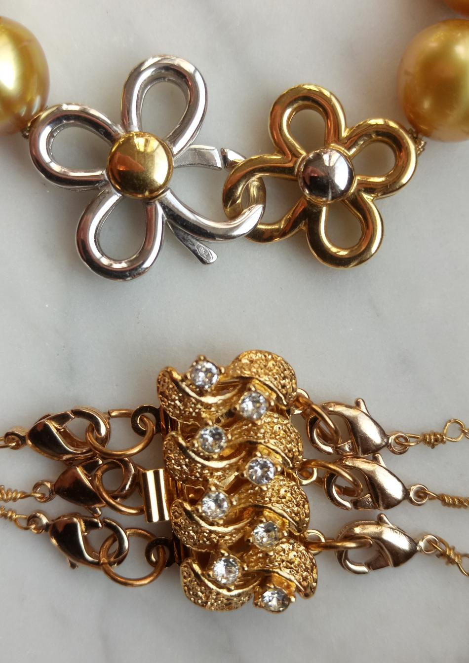 I have had made by my jeweller, a rose gold with garnet cabochon clasp, a solid opal and diamond clasp, both of these I dissect as I enjoy these on